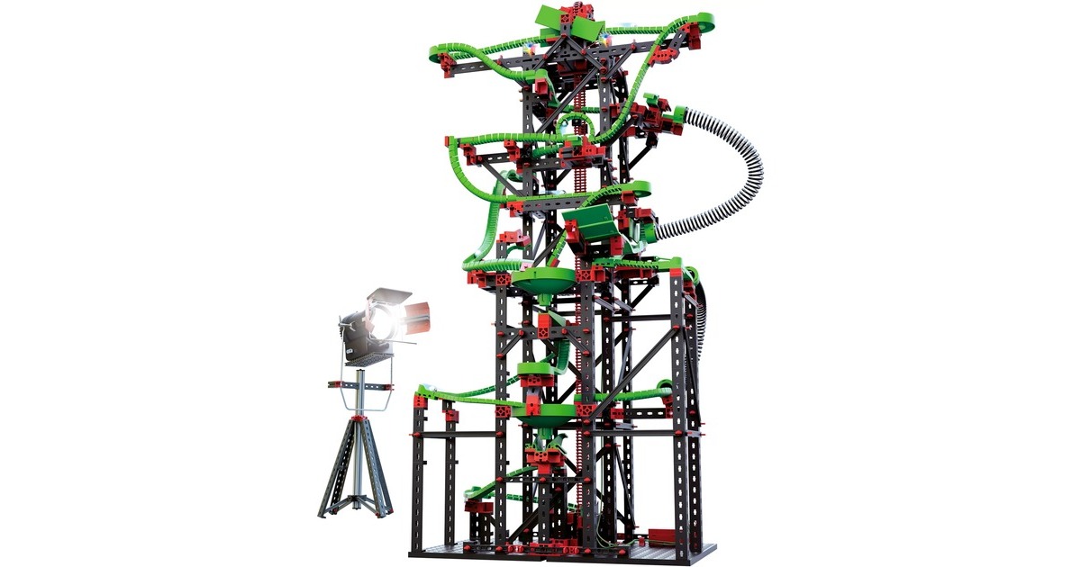 Größer, größer, Dynamic XXL: Dieses Set aus der Kugelbahn-Welt von fischertechnik ist mit 1310 Teilen wirklich riesig. Genau so wie der Spielspaß, denn die drei mit diesem Set baubaren Bahnen sind etwa einen Meter hoch und haben eine Streckenlänge von bis zu 5,6 Metern. Mit dabei sind jede Menge originelle Bauteile: Mit den Flexschläuchen ergeben sich ganz neue Baumöglichkeiten, außerdem lassen sich eine mechanische Wippe, eine Quarterpipe, ein Sprung-Looping und viele weitere spannende Schikanen bauen. Unten angekommen werden die Kugeln über den mit einem XS-Motor betriebenen Kettenaufzug wieder nach ganz oben transportiert. Durch die Erweiterung dieses Baukastens mit den separat erhältlichen Plus-Sets Bluetooth Control Set und Motor Set XS können Schikanen wie die Weichenstellungen mit dem Smartphone oder Tablet gesteuert werden. Art.-Nr.: 100016659