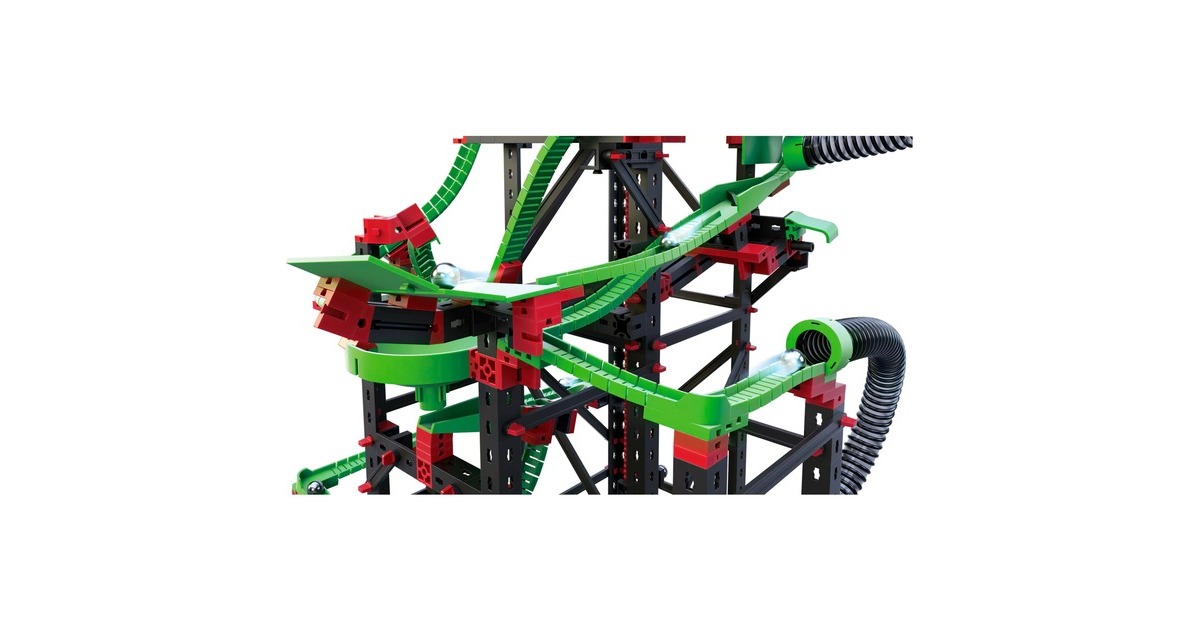 XS Motor, 2 Rainbow-LED, 2x Flexschlauch 360, 7 90°-Kurve, 5 180°-Kurven, 7 Highspeed-Flexschienen, 8 Flexschienen 90, 16 Flexschienen 180, 8 Kugel, 2 Wechselweiche, 2 Kreiseltrichter, Batteriehalter für 9V-Block (Batterie nicht enthalten) |