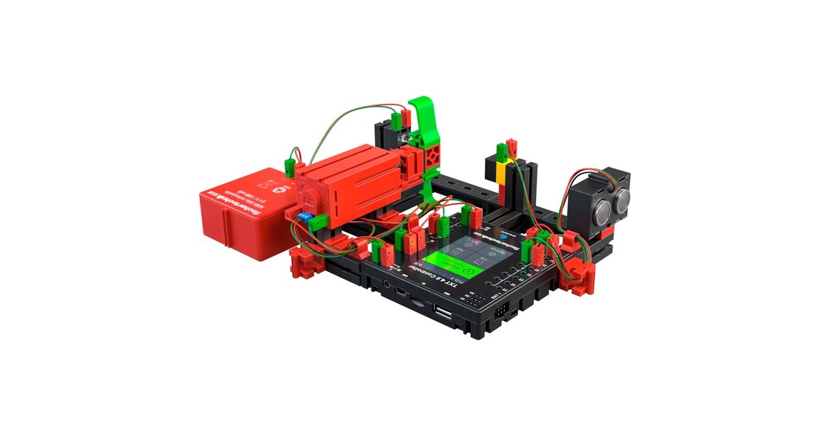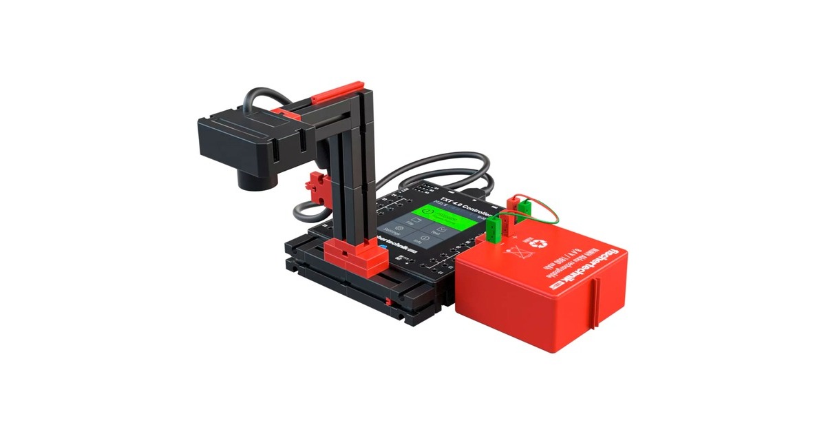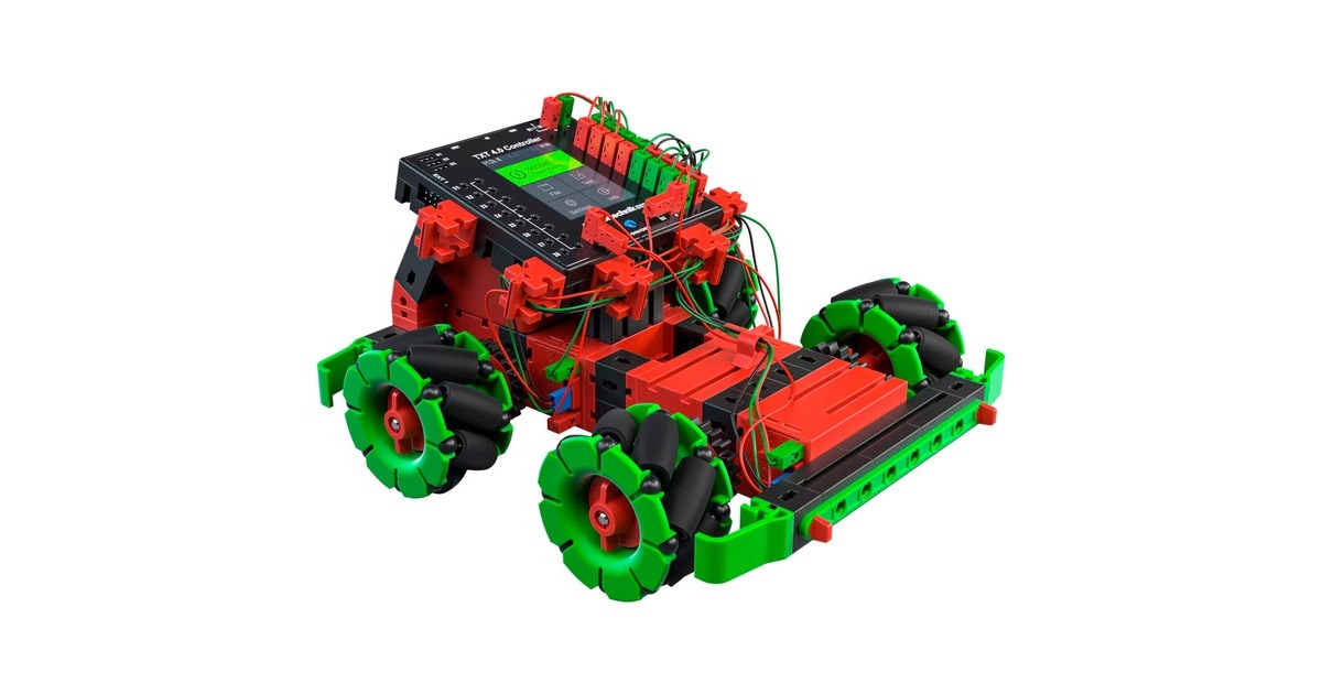 580 Teile, darunter 4 Encodermotoren, 1 Servomotor, 1 USB-Kamera (1 MP), 1 Ultraschallsensor, 1 IR-Spursensor, 2 LEDs, 1 TXT 4.0 Controller, 1 Akkupack, 1 Ladegerät, 1 USB-Verbindungskabel |