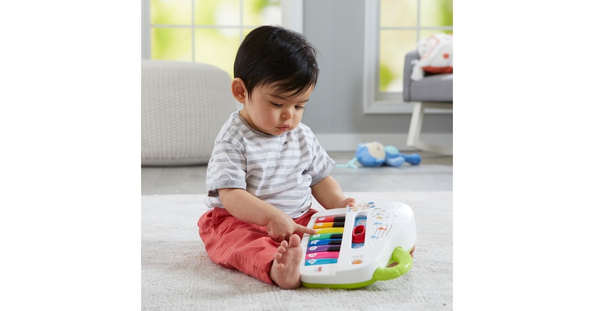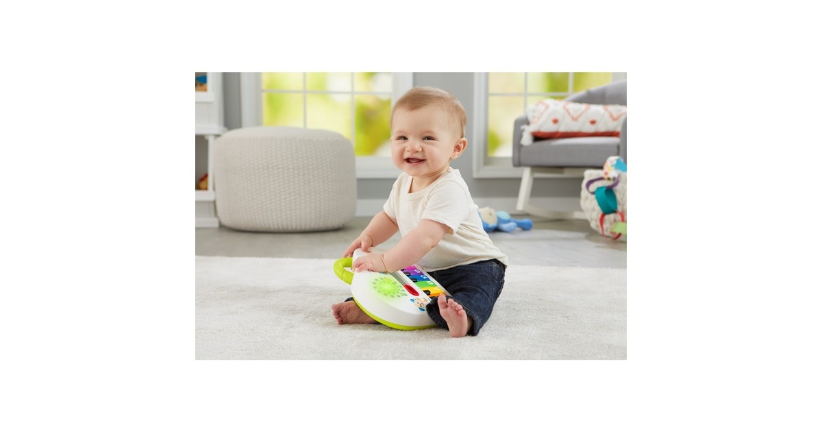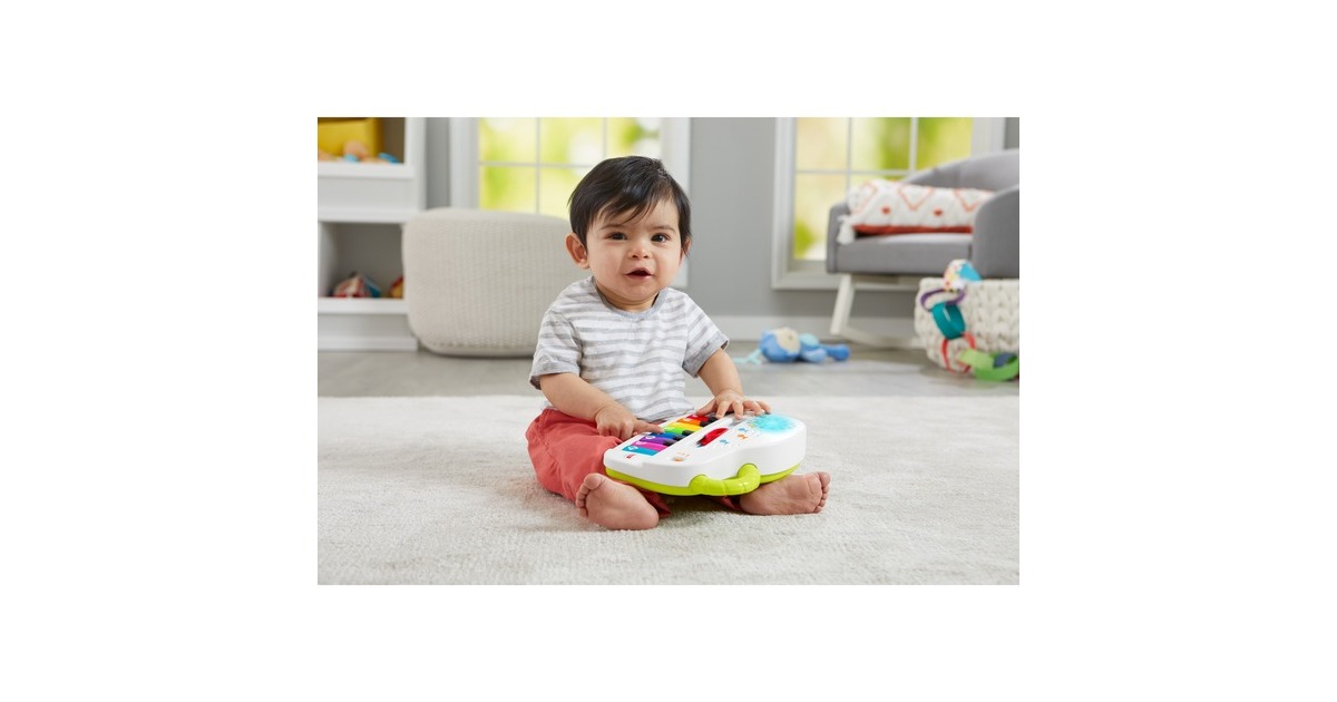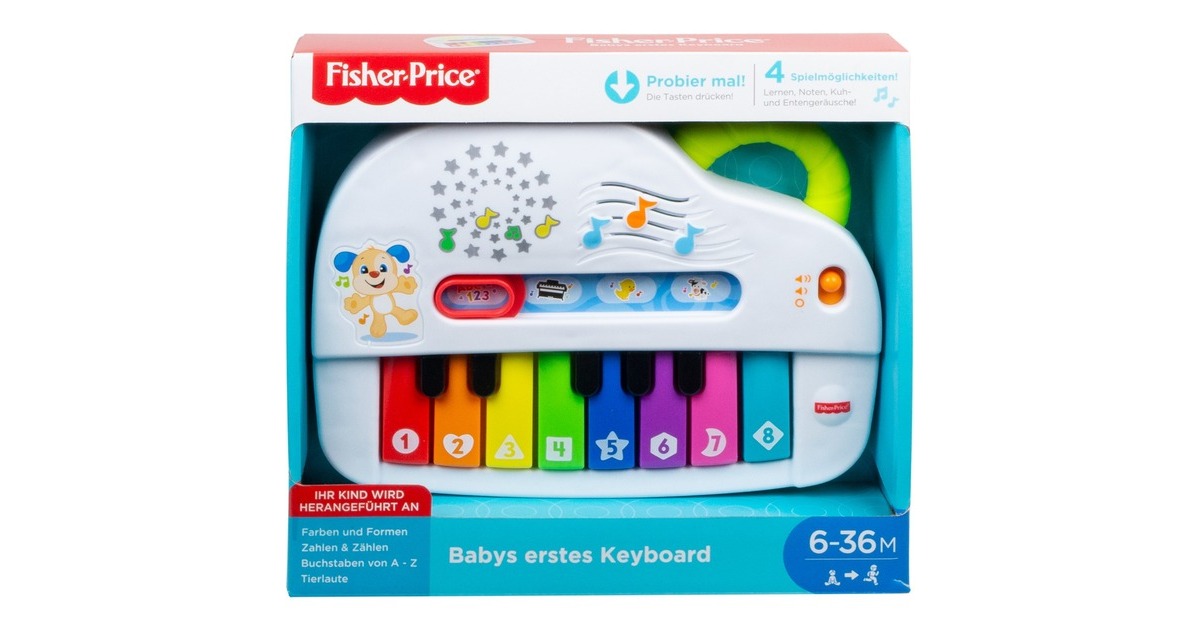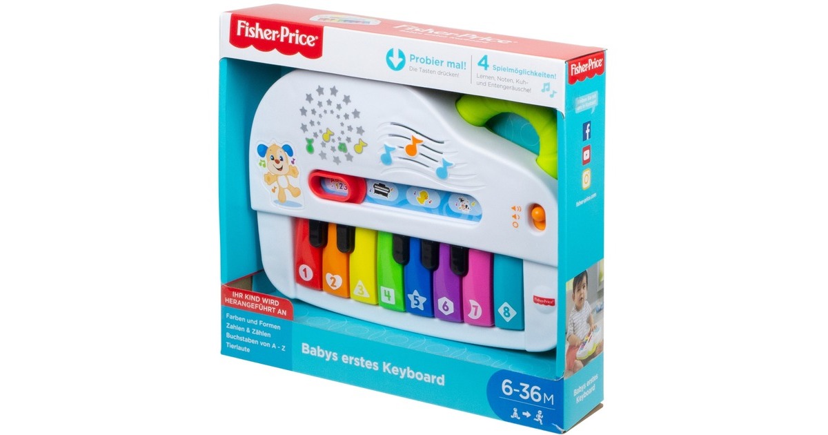 Fisher-Price Babys erstes Keyboard kann auf vier verschiedene Arten gespielt werden und sorgt somit für musikalische Unterhaltung beim „Komponieren“ und spielerischen Lernen. Bei Tastendruck ertönen echte Klavierklänge, quakende Enten, muhende Kühe oder allerlei lustige Lieder und Sätze über Farben, Zahlen und Formen. Dabei leuchtet das Klavier auf. Dank des praktischen Griffs kann dieser musikalische Spaß überall hin mitgenommen werden! Spielerische Lieder und Sätze führen Kinder an das Alphabet, Farben, Formen, Zahlen und mehr heran! Durch das Drücken der Tasten zum Abspielen von Liedern, Geräuschen und Klaviernoten in Kombination mit bunten Lichtern werden Kleinkinder auf spaßige Weise an Ursache und Wirkung herangeführt. Durch den Übergang vom Hämmern in die Tasten zum Spielen mit einzelnen Tasten und das Greifen des Schiebereglers zum Vor- und Zurückschieben werden Geschicklichkeit und Auge-Hand-Koordination geschult.Art.-Nr.: 1514888