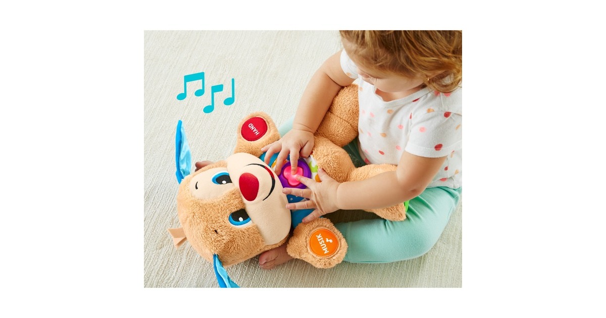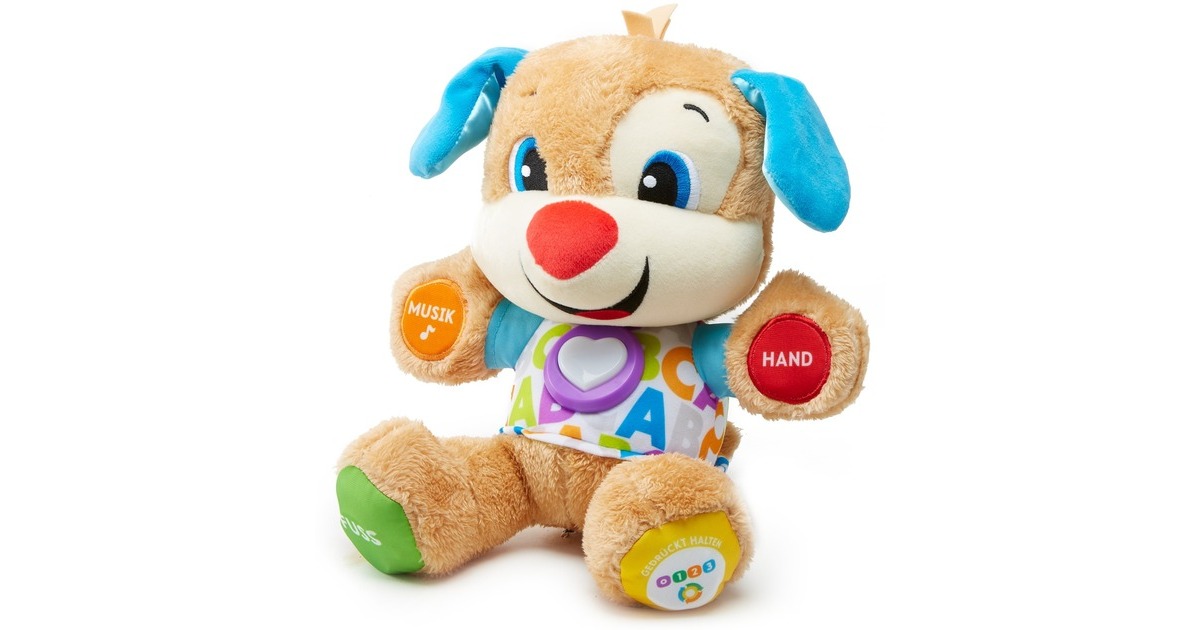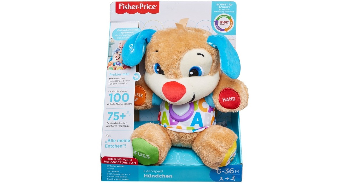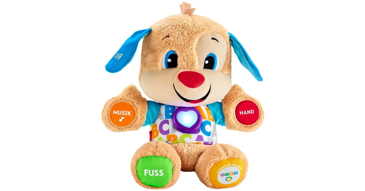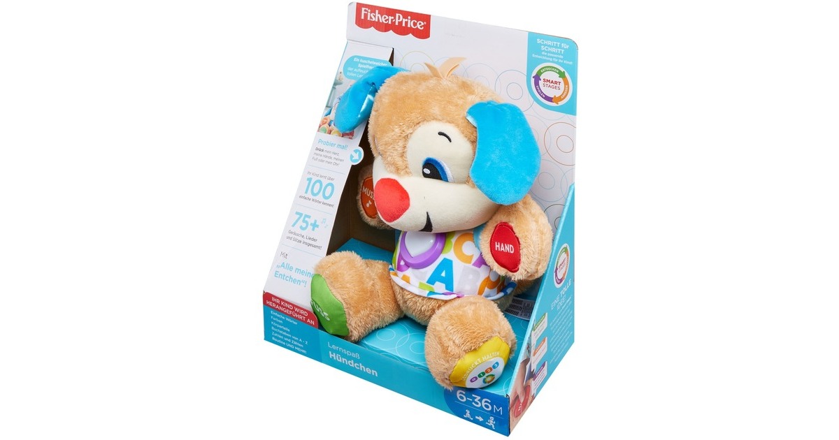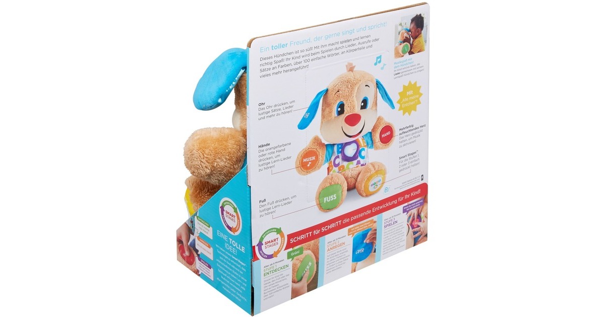 Der beste Freund des Kindes sorgt für Lernspaß ohne Ende, indem er auf Berührungen mit tollen Liedern zum Mitsingen und Sätzen reagiert, die mit insgesamt über 100 einfachen Wörtern, Körperteilen, Farben, Formen und mehr vertraut machen. Und weil sich jedes Kind in seinem eigenen Tempo entwickelt, verfügt das kuschelig weiche Hündchen über die Smart-Stages-Technologie, damit die Eltern die Stufe auswählen können, die für das Kind am besten geeignet ist. Jede der drei Spielstufen hält eine Reihe von Liedern, Geräuschen und Sätzen bereit. Außerdem prangt auf dem Bauch des Hündchens ein Herz, das im Takt der Musik mehrfarbig blinkt. Stufe 1 – Entdecken – Drückt das Kind die Hände, den Fuß, das Herz, die Nase oder das Ohr des Hündchens, hört es einfache Wörter, Farben, Buchstaben, Körperteile und mehr. Stufe 2 – Anregen – Auf dieser Stufe wird das Kind dazu angeregt, zu zählen, Farben zu erkennen und Körperteile zu finden. Lustige Sätze belohnen es für seine Aktivitäten. Stufe 3 – Spielen – Das Hündchen animiert das Kind durch Sätze oder Lieder zum Mitsingen zum Rollenspiel und dazu, seiner Fantasie freien Lauf zu lassen. Und ganz nebenbei wird auf spielerische Art und Weise der Wortschatz des kleinen Lieblings erweitert.Art.-Nr.: 1754377