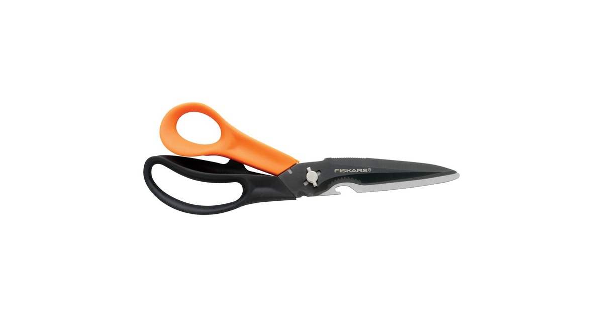 Clever, handlich und multifunktional, das ist die Mehrzweckschere aus der Cuts+More Serie von Fiskars. Das ultimative Mehrzwecktool für Rechtshänder ist weit mehr als nur eine scharfe, handliche Schere mit spitzen, trennbaren Klingen aus rostfreiem Stahl. Die 23cm lange und 184 Gramm schwere Schere verfügt über Extras wie einen Drahtschneider, einen Flaschenöffner, einen Bandabschneider sowie eine Power-Kerbe zum Durchtrennen dünner Kordeln und Seile. Die komfortablen, ergonomischen Griffe in Fiskars-Orange und klassischem Schwarz bieten einen guten und sicheren Halt bei allen Schneidearbeiten. Die Titaniumbeschichtung der Klingen verlängert die Lebensdauer der Schere und erhöht die Widerstandsfähigkeit der Klingen. Ganz nebenbei lässt sich die Schere damit auch leichter und schneller reinigen. Ein cleverer und multifunktionaler Helfer, der im Alltag und Haushalt ebenso seine Stärken ausspielt wie beim Campingtrip oder im Sommerhaus. Dank ihrer Schutzhülle mit integriertem Scherenschärfer ist die Mehrzweckschere immer und jederzeit dabei. Art.-Nr.: 1412063