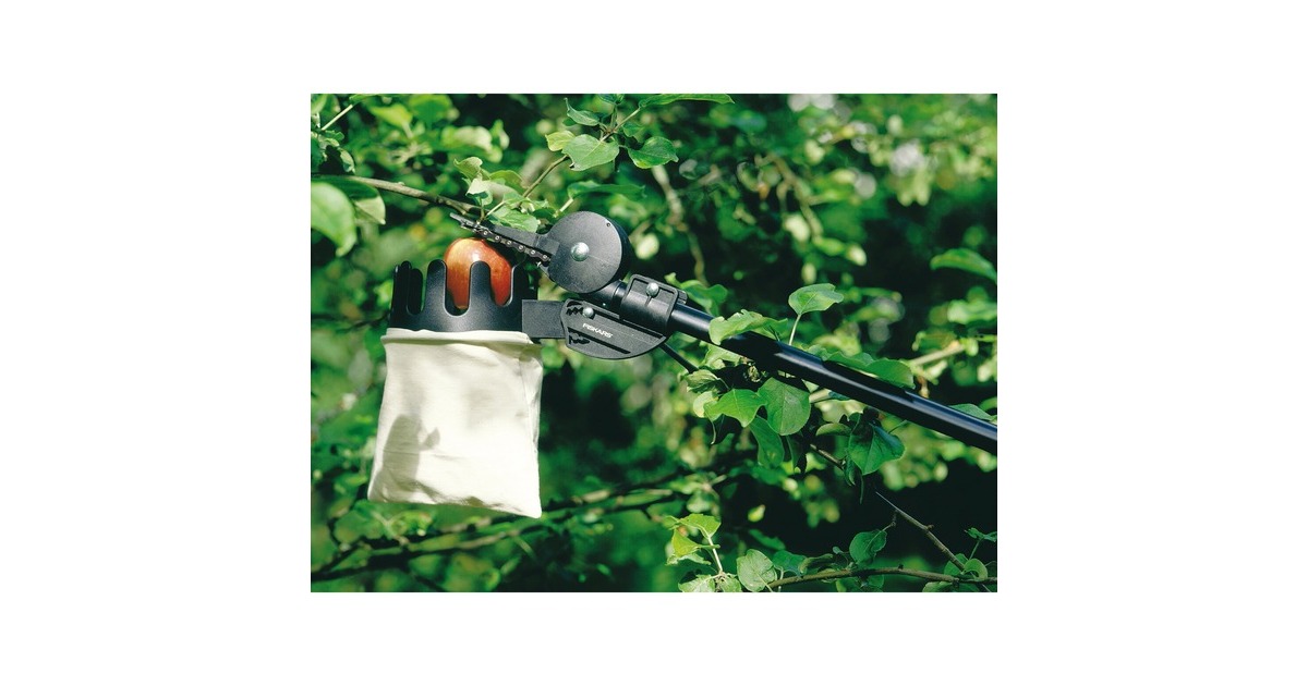 Der Obstpflücker 1001562 von Fiskars lässt sich ganz einfach an eine der drei Modelle der Fiskars Schneidgiraffen anbringen. Er passt sowohl zu der Teleskop-Schneidgiraffe als auch zu der langen sowie zu der "normalen" Schneidgiraffe gleichermaßen gut. Praktisch dabei ist, dass man für die Anbringung keinerlei Werkzeug benötigt. Die Befestigung erfolgt über einen speziellen Verschluss am Obstpflücker selbst. Er besteht aus verschiedenen Materialien - zum einen aus glasfaserverstärktem Kunststoff, zum anderen aus gehärtetem Aluminium. Beide Materialien sorgen für die Langlebigkeit der Halterung sowie für ihre Stabilität. Das Auffangsäckchen für das Obst ist hergestellt aus weißer Baumwolle. Insgesamt wiegt der Obstpflücker gerade mal 219 Gramm, bei einer Gesamtlänge von 29 Zentimetern. Der Durchmesser der Halterung für das Auffangsäckchen beträgt 16 Zentimeter. Die stabilen Teile des Obstpflückers sind schwarz und passen farblich zu den kombinierbaren Modellen der Fiskars Schneidgiraffen. Mit dem Obstpflücker kann man sich endlich über frisches Obst ohne Druckstellen, die vom Herunterfallen auf den Boden kommen, freuen. Art.-Nr.: 1412139