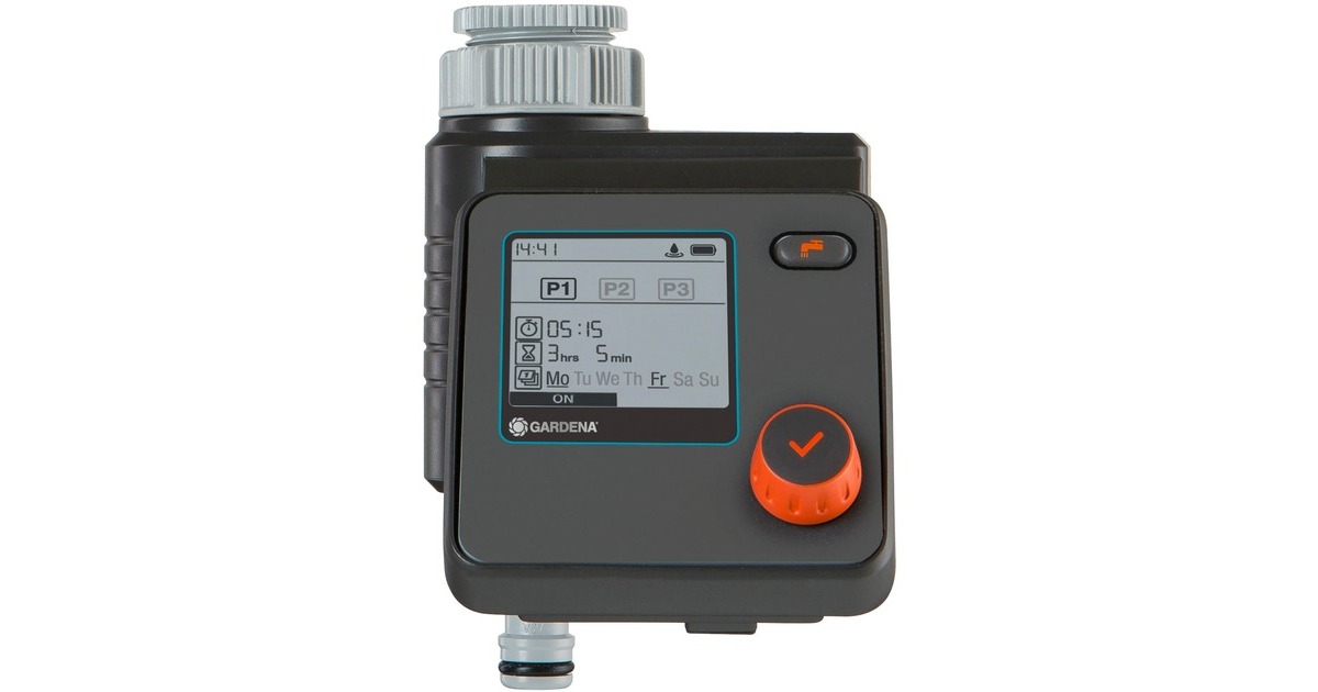 Die GARDENA Bewässerungssteuerung Select entlastet bei der Gartenbewässerung, z.B. beim Betrieb von Regnern, dem GARDENA Sprinklersystem, auch mit dem GARDENA Micro-Drip-System. Der Bewässerungscomputer wird direkt an den Wasserhahn angeschlossen und steuert die Bewässerung zuverlässig zur eingestellten Zeit und Dauer. Damit muss man weder im Alltag noch während des Urlaubs ans Gießen denken, weil alles automatisch nach den eigenen Wünschen läuft. Für die Bewässerung lassen sich drei unterschiedliche und völlig voneinander unabhängige Zeitpläne erstellen. Einstellbar sind Start, Dauer und Wochentage der Bewässerung, so lassen sich ganz flexible Pläne nach dem persönlichen Geschmack einstellen. Das Bedienteil lässt sich abnehmen, um es bequem zu programmieren. Auf dem übersichtlichen LCD-Display werden die ausgewählten Einstellungen angezeigt. Das Programmieren ist selbsterklärend und geht ganz leicht. Danach steckt man das Bedienteil wieder an. Hat man einmal die Vorgaben eingestellt, steuert der Computer das Gießen automatisch nach den eigenen Wünschen. Die Funktion "Sofort Bewässern" ermöglicht eine manuelle Bewässerung oder das Befüllen eines Eimers ohne Abschrauben der Bewässerungssteuerung und stoppt automatisch wieder nach vorgegebener Dauer. Außerdem ist die Bewässerungssteuerung Select sensorfähig, ein angeschlossener Sensor (separat erhältlich) misst die Bodenfeuchte und unterbricht den Zeitplan, wenn es zum Gießen zu nass ist. Mit einer 9 V Alkaline Batterie (nicht im Lieferumfang enthalten) funktioniert die Bewässerungssteuerung Select zuverlässig ca. ein Jahr lang.Art.-Nr.: 1491791