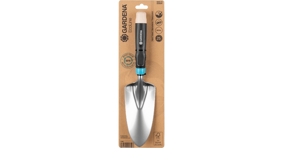 Die EcoLine Blumenkelle FSC von GARDENA eignet sich ideal zum An- und Umpflanzen in Pflanzkübeln, schmalen Beeten oder Blumenkästen. Dabei setzt sie voll auf Nachhaltigkeit. Der hochwertige, beschichtete Qualitätsstahl ist zu mehr als 25% aus recyceltem Metall gewonnen, und die Kunststoffkomponenten am ergonomischen Griff sind zu mehr als 85% aus recyceltem Material hergestellt. Das Holzelement aus FSC-zertifiziertem Buchenholz am Griffende runden das wertige Erscheinungsbild harmonisch ab. Besonderer Wert wurde außerdem auf Qualität, Funktionalität und Langlebigkeit gelegt.Art.-Nr.: 1806003