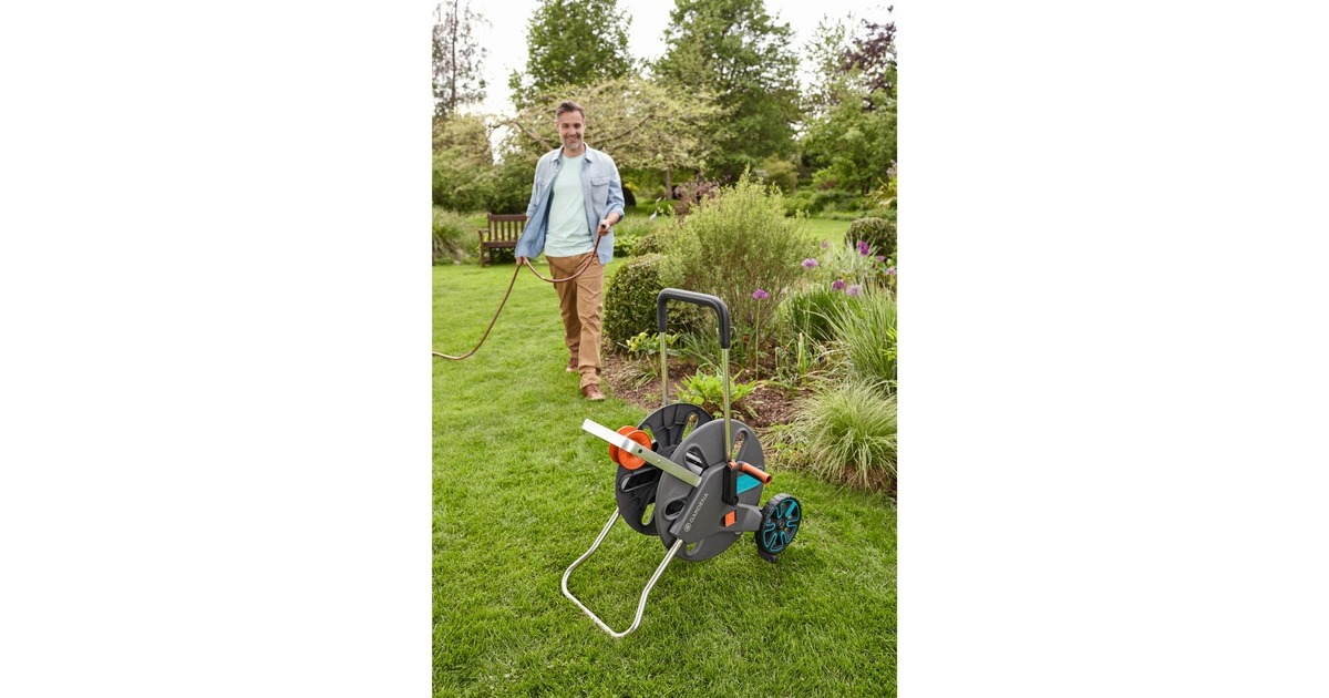Der GARDENA Schlauchwagen CleverRoll L Easy (18520-20) ist mit einem höhenverstellbaren Griff, abgewinkeltem Schlauchanschluss, Nachtropf-Stop und einer einklappbaren Kurbel ausgestattet. Die komfortable Schlauchführung mit extra stabilem Metall-Rahmen sorgt dafür, dass der Schlauch in gleichmäßigen Lagen aufgerollt wird. Da nur die Kurbel an der Schlauchtrommel betätigt wird, bleiben die Hände dabei sauber. Die neue Kick&Stand-Funktion macht den Schlauchwagen CleverRoll L Easy absolut standsicher: Kein Umfallen mehr durch den ausklappbaren Standfuß. Seine spezielle Form sowie der sichtbare Räder-Hochstand unterstützen zudem die Standsicherheit des Schlauchwagens. Zur Aufbewahrung wird der Standfuß einfach wieder eingeklappt. Der Nachtropf-Stop verhindert, dass beim Transport oder nach Gebrauch des Schlauchwagens Wasser ausläuft.