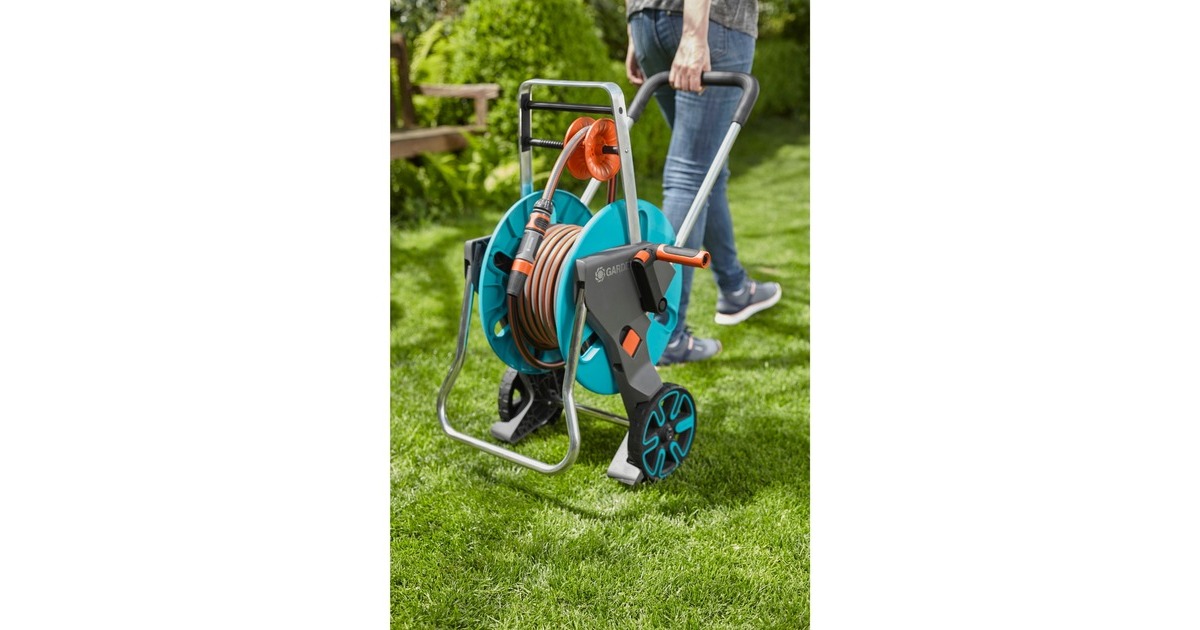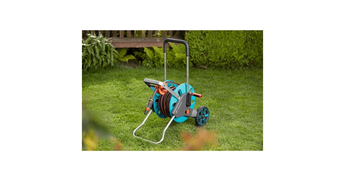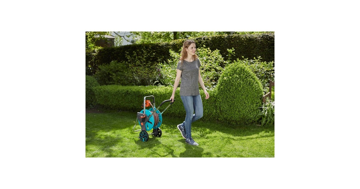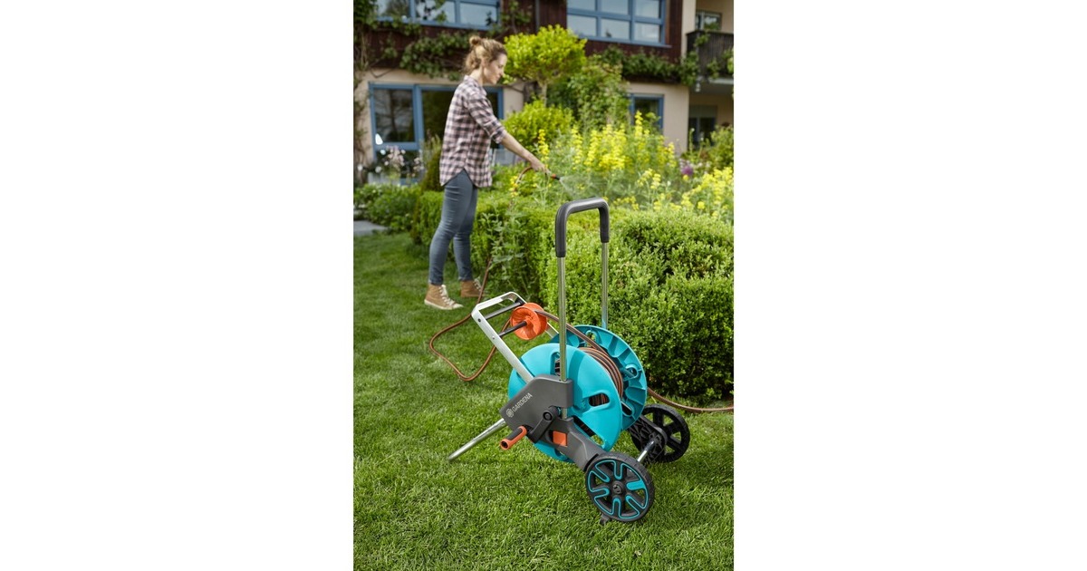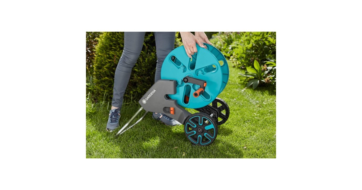 Das GARDENA Schlauchwagen-Set CleverRoll M Easy (18517-20) ist mit einem höhenverstellbaren Griff, abgewinkeltem Schlauchanschluss, Nachtropf-Stop und mit einem 20 Meter langen FLEX-Schlauch von 13mm (1/2“) Durchmesser und allen nötigen Original GARDENA Systemteilen, sowie einer stufenlos regulierbaren Spritze ausgestattet. Die komfortable Schlauchführung mit extra stabilem Metall-Rahmen sorgt dafür, dass der Schlauch in gleichmäßigen Lagen aufgerollt wird. Da nur die Kurbel an der Schlauchtrommel betätigt wird, bleiben die Hände dabei sauber. Die neue Kick&Stand-Funktion macht den Schlauchwagen CleverRoll M Easy absolut standsicher: Kein Umfallen mehr durch den ausklappbaren Standfuß. Seine spezielle Form sowie der sichtbare Räder-Hochstand unterstützen zudem die Standsicherheit des Schlauchwagens. Zur Aufbewahrung wird der Standfuß einfach wieder eingeklappt. Der Nachtropf-Stop verhindert, dass beim Transport oder nach Gebrauch des Schlauchwagens Wasser ausläuft.