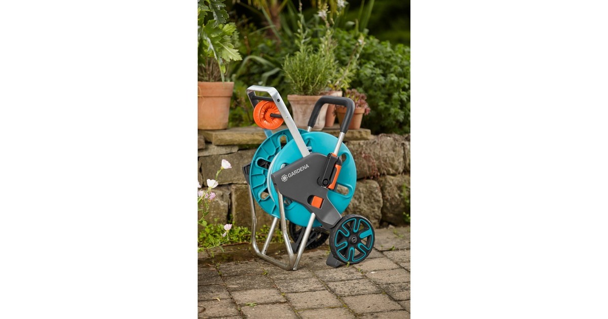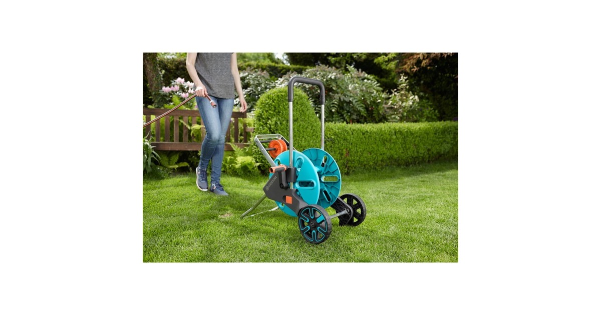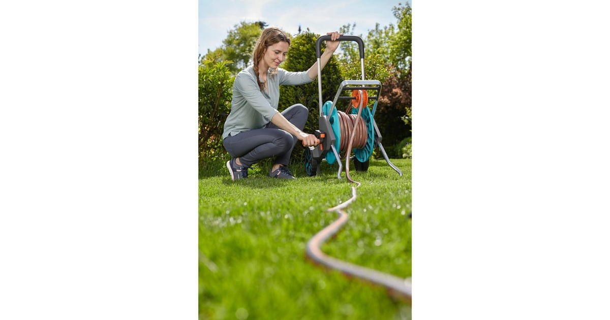 Der GARDENA Schlauchwagen CleverRoll M Easy (18515-20) ist mit einem höhenverstellbaren Griff, abgewinkeltem Schlauchanschluss, Nachtropf-Stop und einer einklappbaren Kurbel ausgestattet. Die komfortable Schlauchführung mit extra stabilem Metall-Rahmen sorgt dafür, dass der Schlauch in gleichmäßigen Lagen aufgerollt wird. Da nur die Kurbel an der Schlauchtrommel betätigt wird, bleiben die Hände dabei sauber. Die neue Kick&Stand-Funktion macht den Schlauchwagen CleverRoll M Easy absolut standsicher: Kein Umfallen mehr durch den ausklappbaren Standfuß. Seine spezielle Form sowie der sichtbare Räder-Hochstand unterstützen zudem die Standsicherheit des Schlauchwagens. Zur Aufbewahrung wird der Standfuß einfach wieder eingeklappt. Der Nachtropf-Stop verhindert, dass beim Transport oder nach Gebrauch des Schlauchwagens Wasser ausläuft.