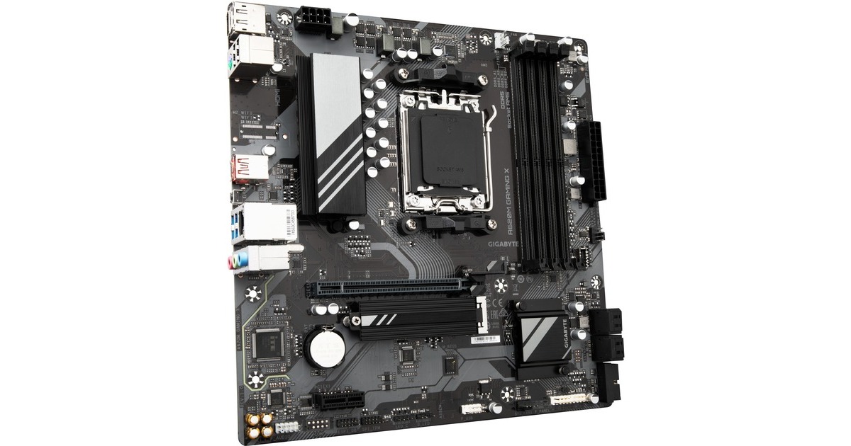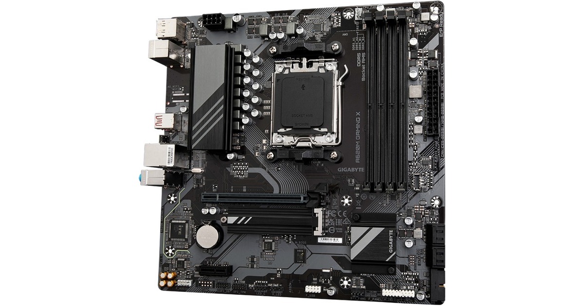 Das GIGABYTE A620M GAMING X basiert auf dem AMD-A620-Chipsatz und unterstützt AMD-Prozessoren für den Sockel AM5. Es verfügt über vier DDR5-Slots für bis zu 128 GB Arbeitsspeicher. Zur weiteren Ausstattung des GIGABYTE A620M GAMING X gehören ein PCIe-4.0-x16-Slot und ein PCIe-3.0-x1-Slot. Außerdem verfügt das GIGABYTE A620M GAMING X über 8-Kanal-Sound, eine Gigabit-LAN-Schnittstelle, vier SATA3-Anschlüsse, einen M.2-Anschluss und eine Reihe an USB Schnittstellen.Art.-Nr.: 1917446