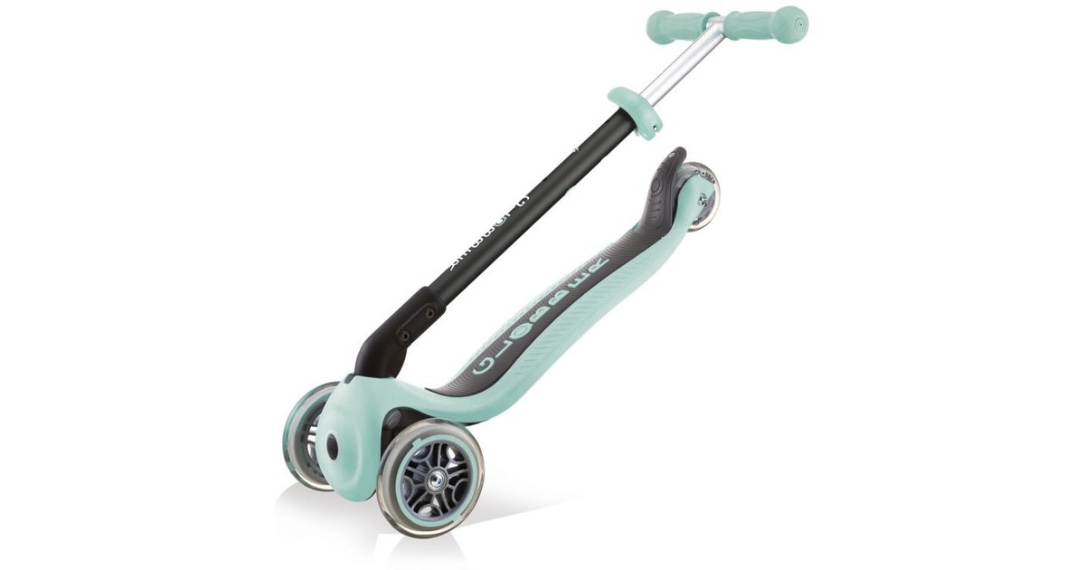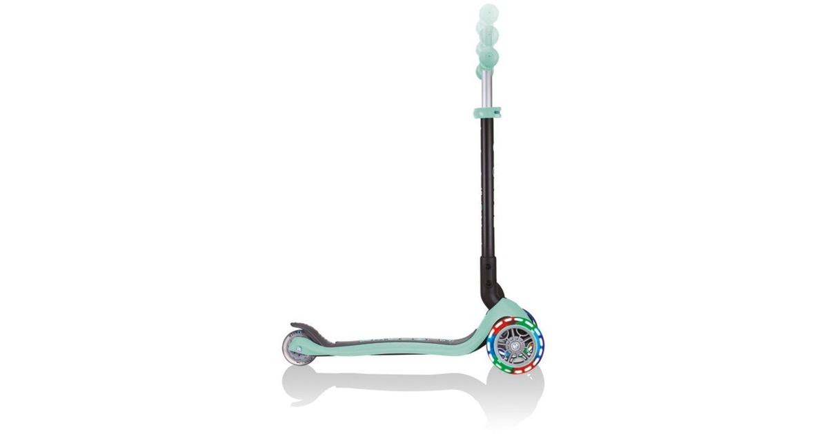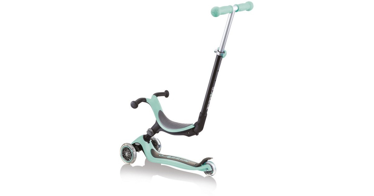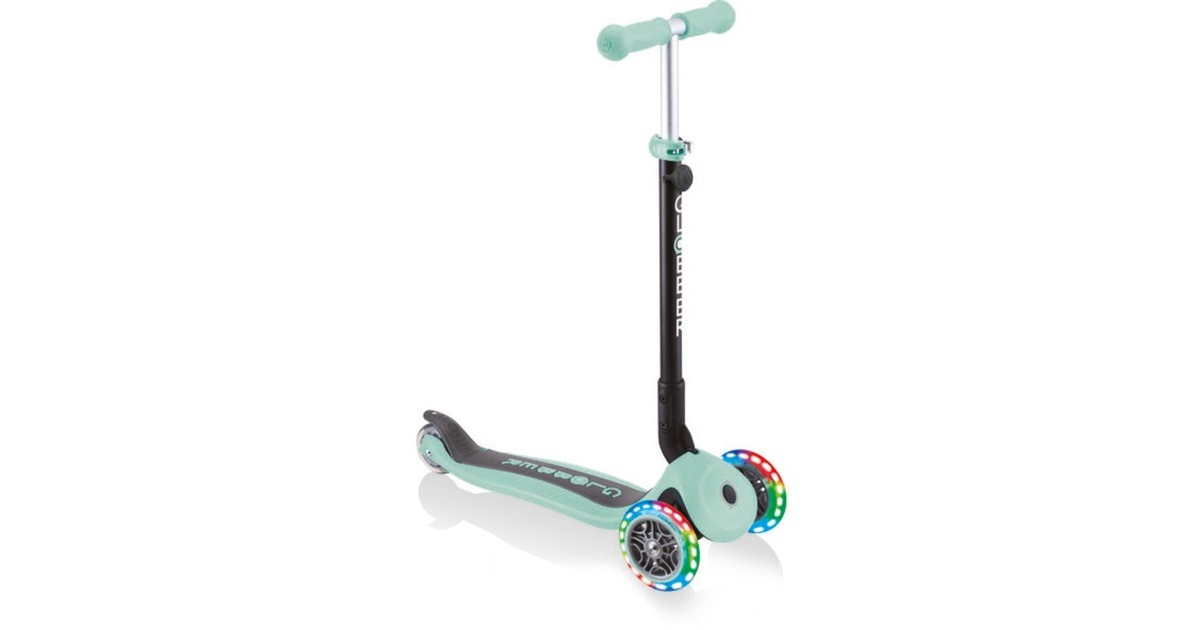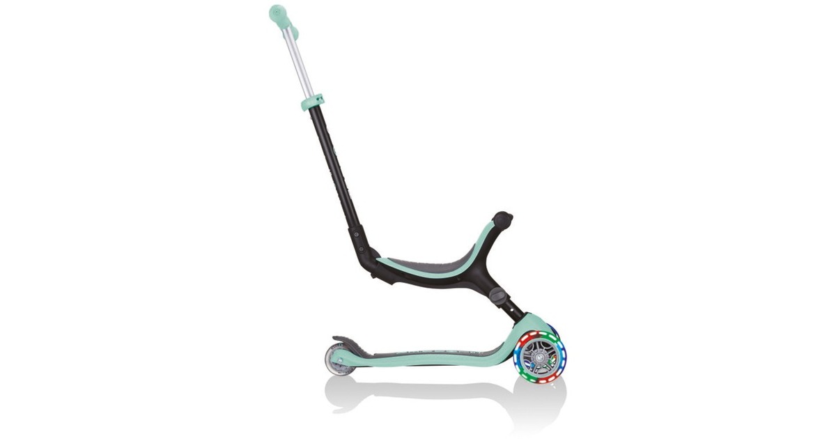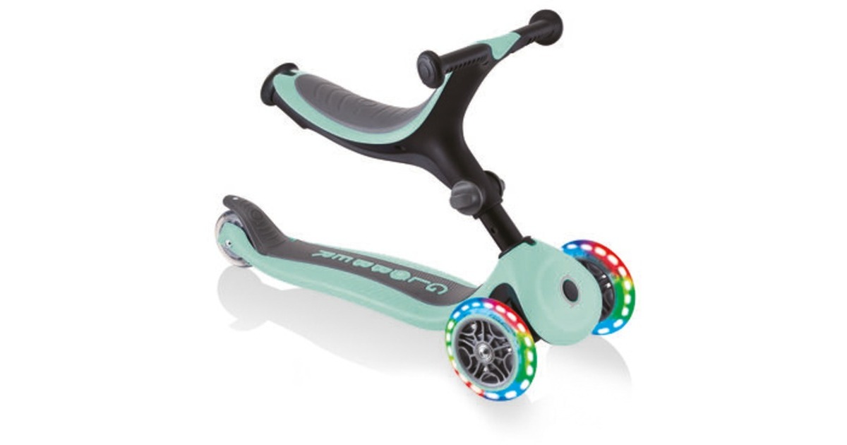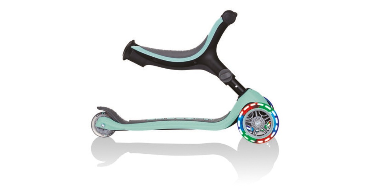 Der Go-Up Foldable Lights von Globber ist ein Kinderfahrzeug mit 3-in-1-Funktion. Neben der Nutzung als Scooter kann er einfach und werkzeuglos zu einem Dreirad mit Schubstange oder zu einem Laufrad umgebaut werden, womit er von Kindern ab einem Alter von 15 Monaten bis 7 Jahren genutzt werden kann. Dabei sorgen gegossene High Rebound PU-Rollen mit ABEC 5-Kugellagern für flottes Vorwärtskommen. Die Vorderräder leuchten dank batterieloser Dynamo-Technologie, sobald der Go-Up bewegt wird. Die extra breite Hinterradbremse ermöglicht sicheres Verzögern, das verstärkt ausgeführte Deck ist mit einer Antirutsch-Trittfläche bezogen. Zum Transport kann dieses Fahrzeug einfach zusammengeklappt und als Trolley gezogen werden. Art.-Nr.: 1731844