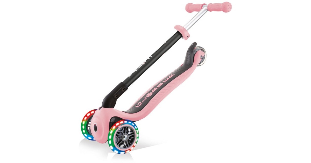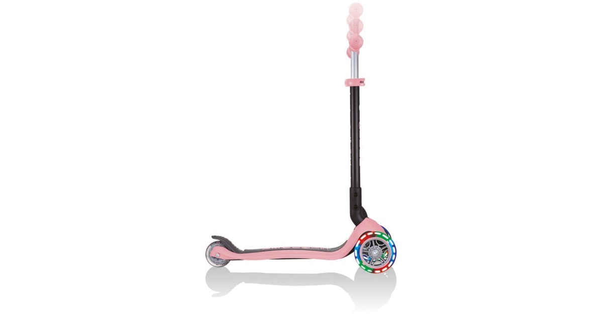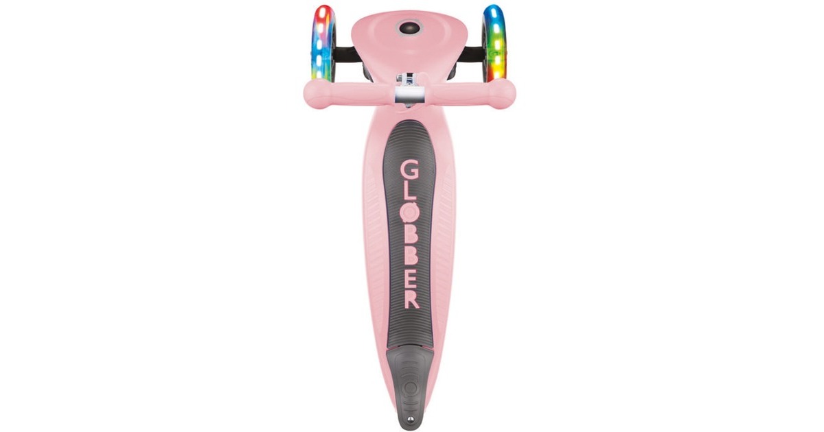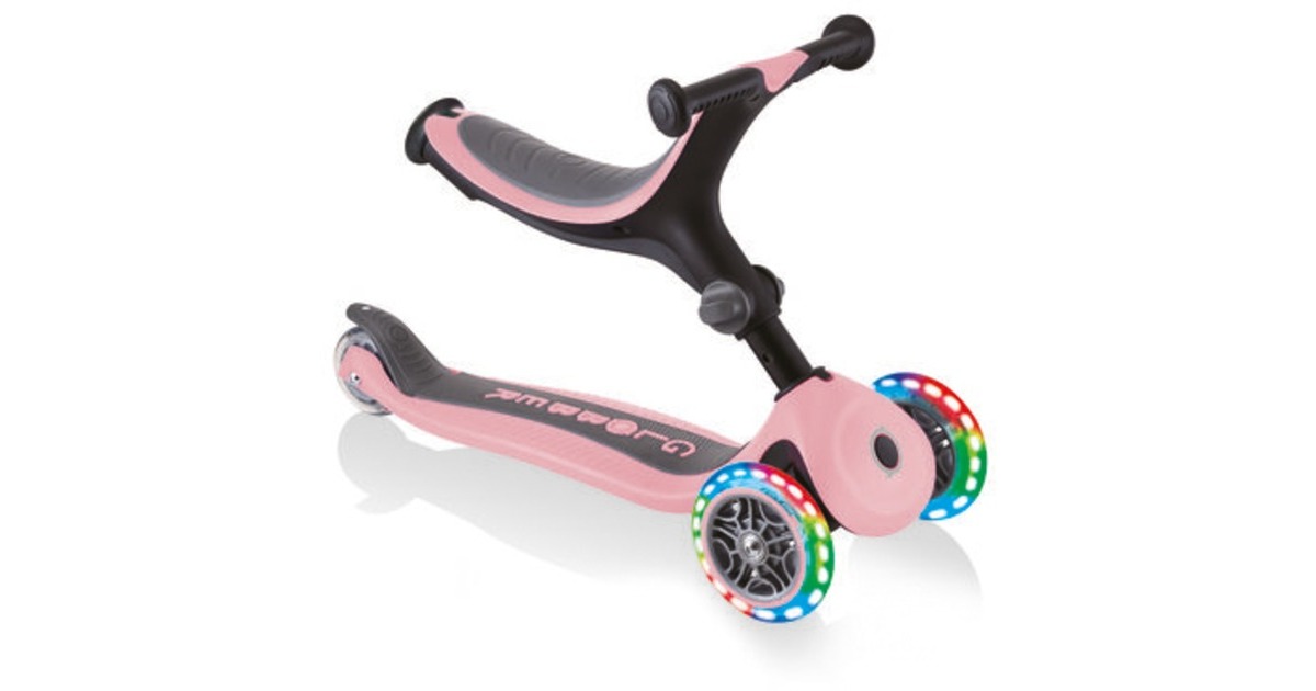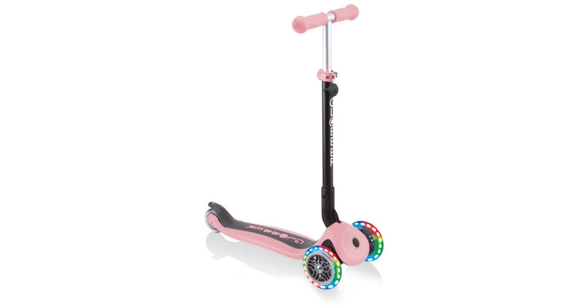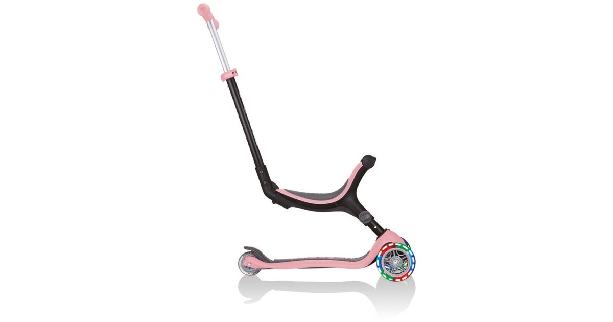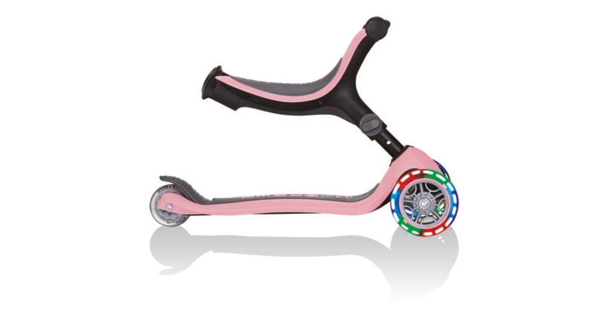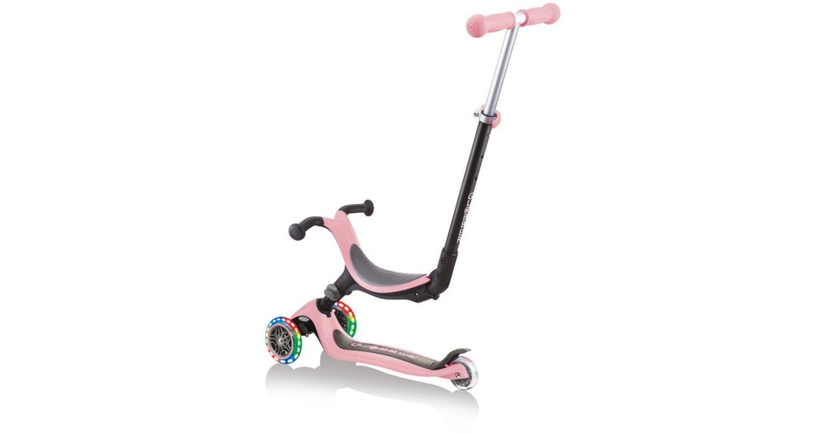 Der Go-Up Foldable Lights von Globber ist ein Kinderfahrzeug mit 3-in-1-Funktion. Neben der Nutzung als Scooter kann er einfach und werkzeuglos zu einem Dreirad mit Schubstange oder zu einem Laufrad umgebaut werden, womit er von Kindern ab einem Alter von 15 Monaten bis 7 Jahren genutzt werden kann. Dabei sorgen gegossene High Rebound PU-Rollen mit ABEC 5-Kugellagern für flottes Vorwärtskommen. Die Vorderräder leuchten dank batterieloser Dynamo-Technologie, sobald der Go-Up bewegt wird. Die extra breite Hinterradbremse ermöglicht sicheres Verzögern, das verstärkt ausgeführte Deck ist mit einer Antirutsch-Trittfläche bezogen. Zum Transport kann dieses Fahrzeug einfach zusammengeklappt und als Trolley gezogen werden. Art.-Nr.: 1731845