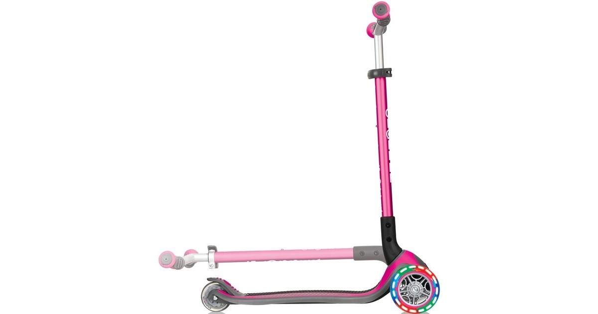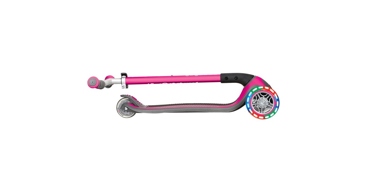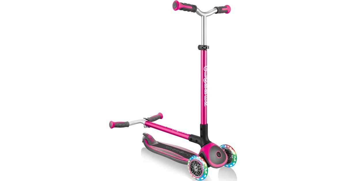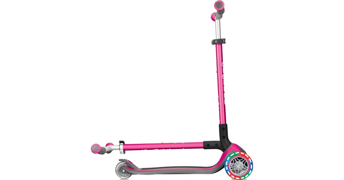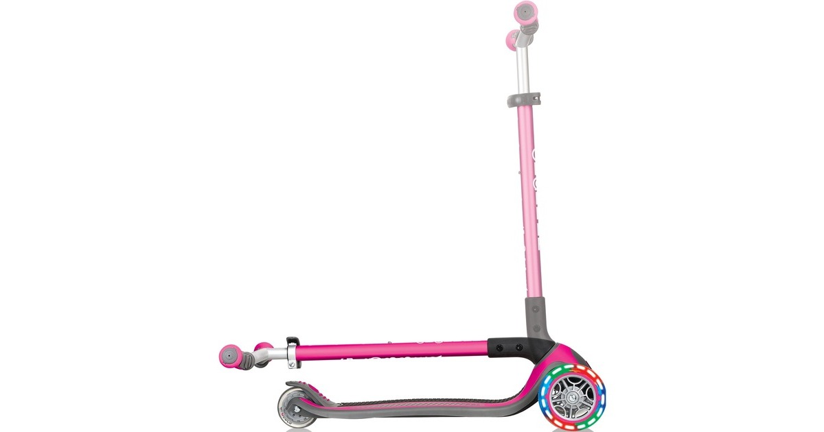Klappbarer Scooter, höhenverstellbarer Lenker, zuschaltbare Lenksperrung, TPR-Griffe, tiefergelegtes, Deck mit EVA und TPR beschichtet, Hinterradbremse, Super High Rebound PU Rollen mit Leuchtfunktion, 120 mm und 80 mm, Kugellager ABEC 5 |