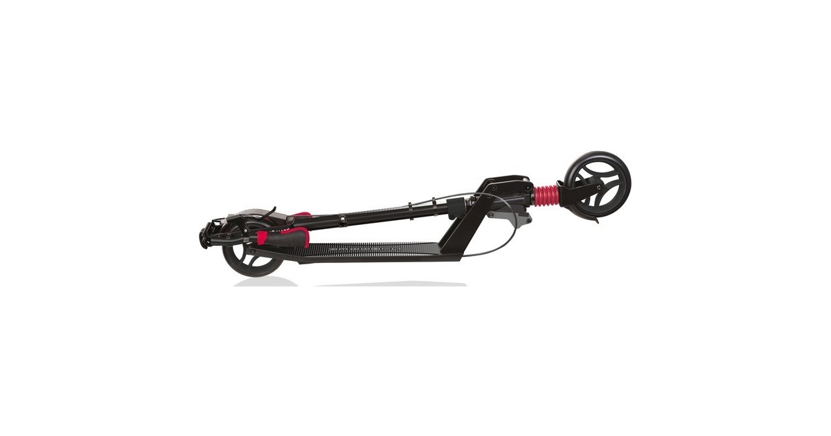 Hochwertiger Scooter mit Handbremse und Frontfederung, Kick and fold-Klappmechanismus, Ständer und Trolley-Modus, gegossene PU-Rollen (Durchmesser 165 mm, 40 mm breit), High Rebound, Kugellager ABEC 7, Hinterradreibungsbremse aus Aluminium, extra breiter Lenker im BMX-Stil mit zweifarbigen, ergonomischen TPR-Griffen und Anti-Vibrations-Klemme, farbige Lenkstange und double clamp aus Aluminium, 3-fach höhenverstellbar von 93-108 cm, inkl. Schnellspanner und Sicherheitsarretierung, robustes Aluminiumdeck mit Antirutsch-Trittfläche, Sicherheitsreflektoren vorne und hinten |