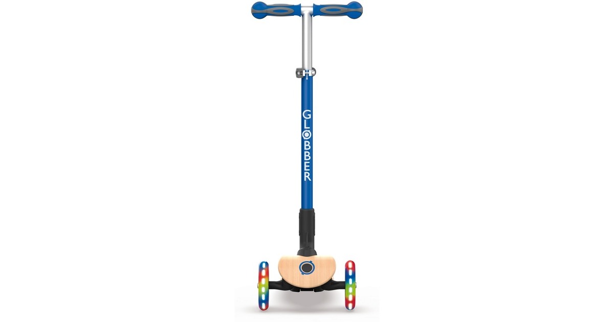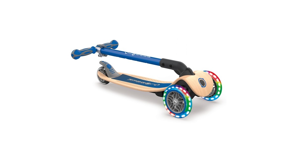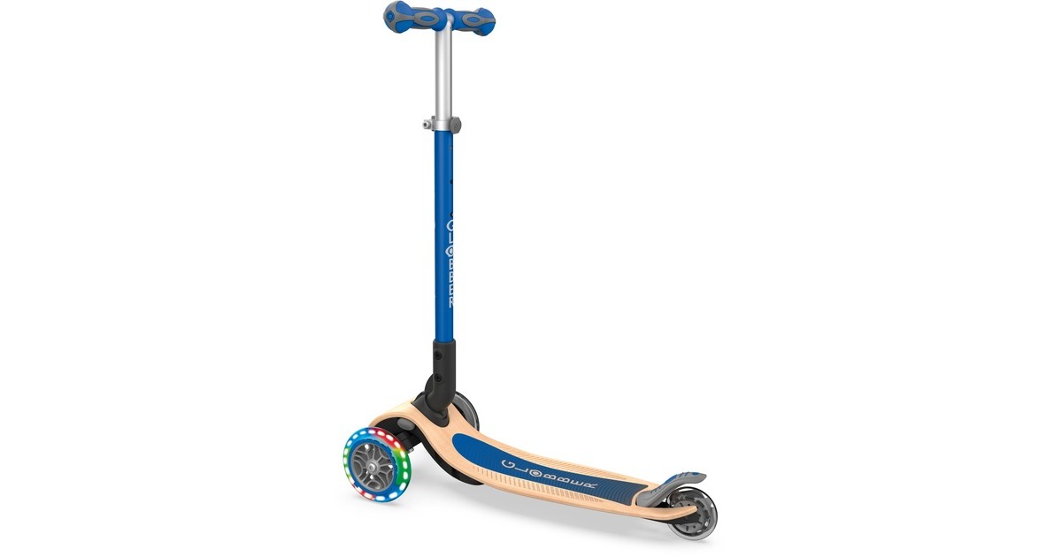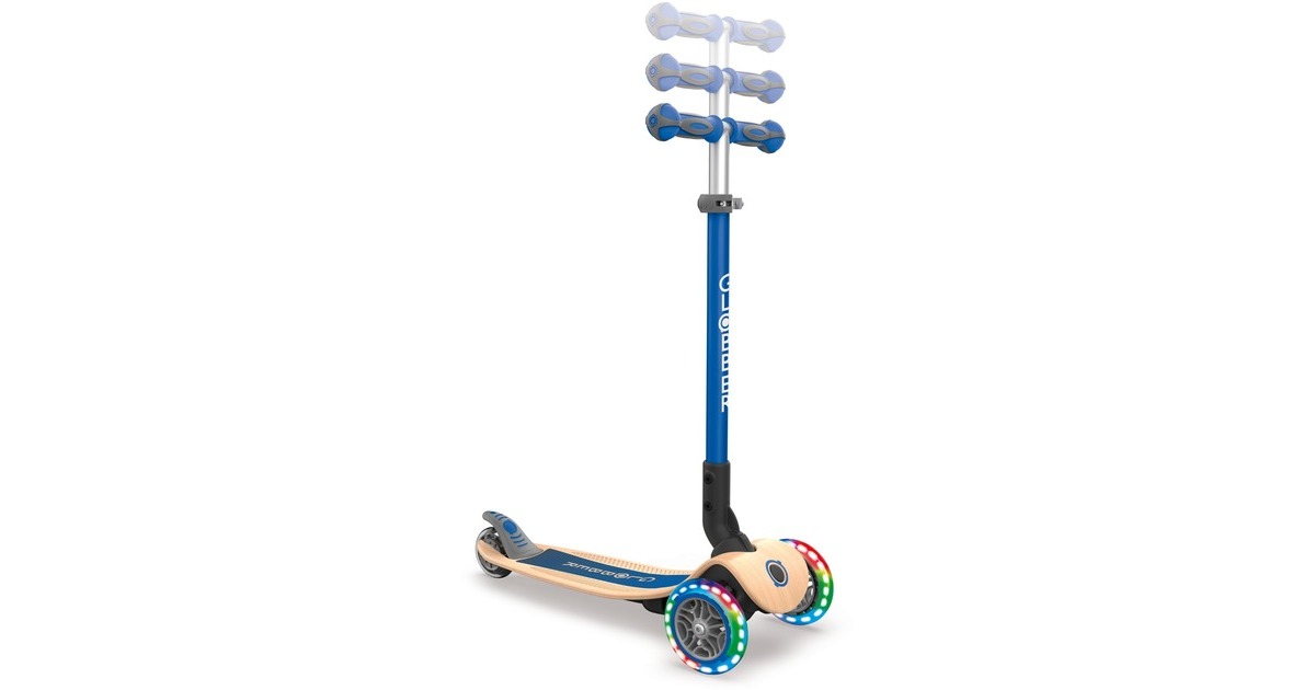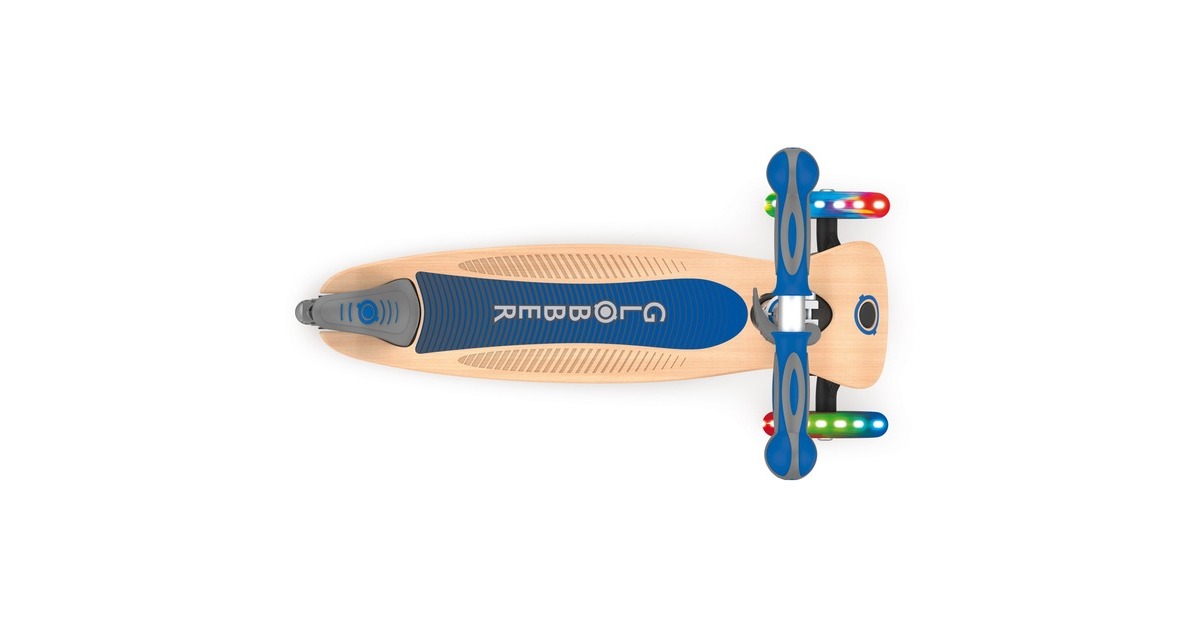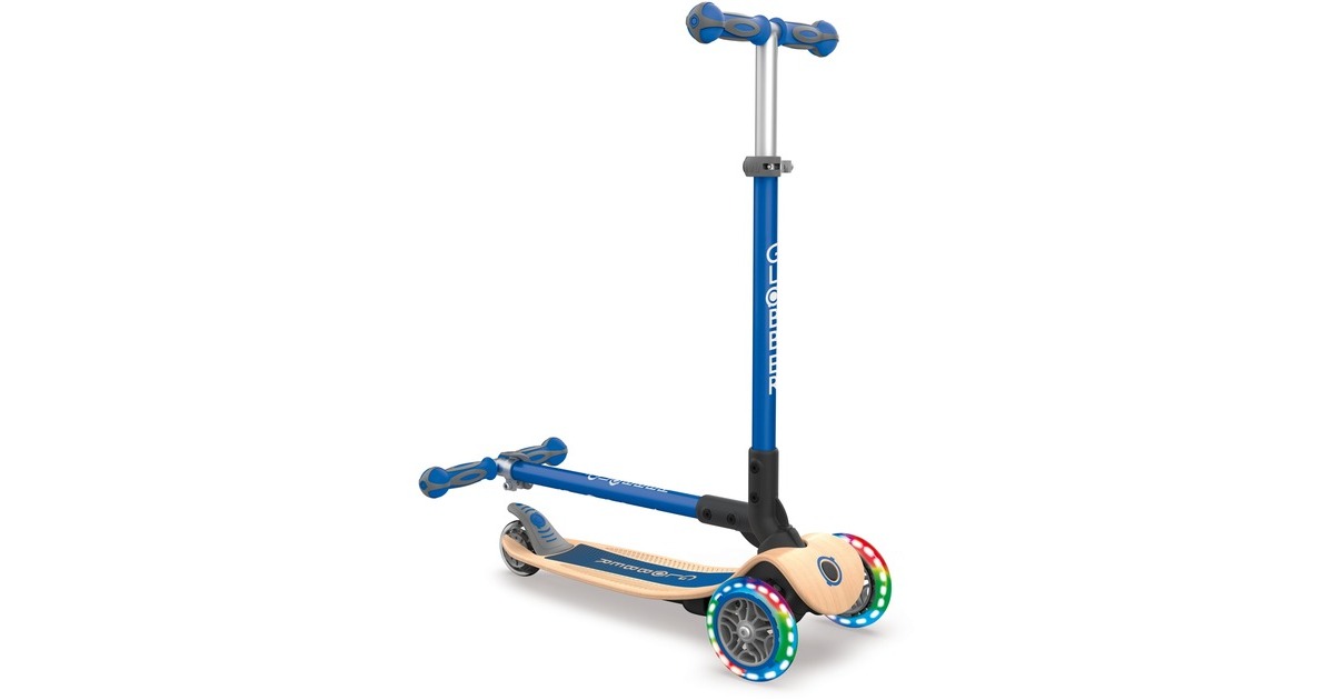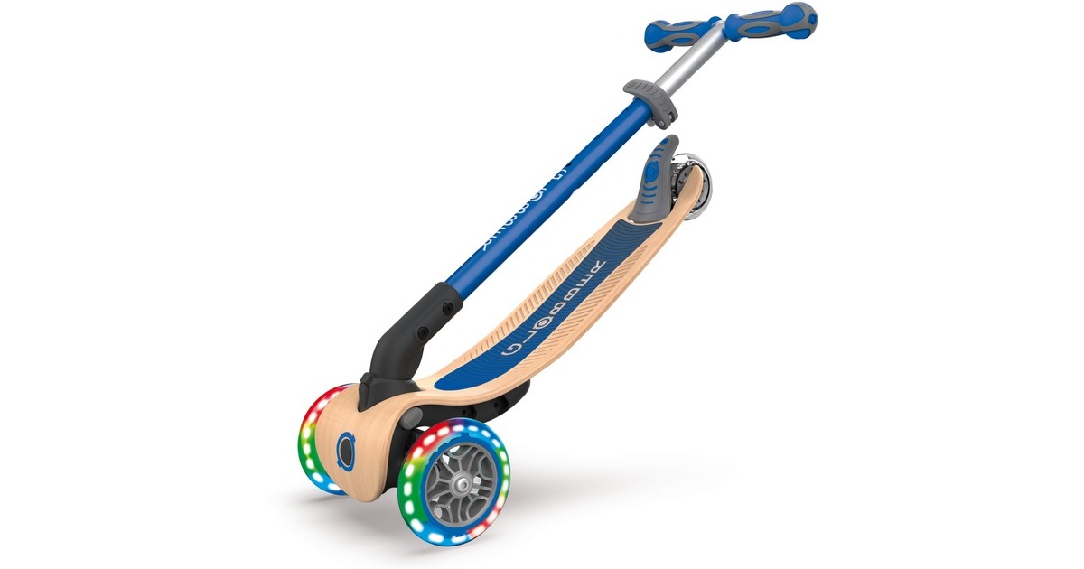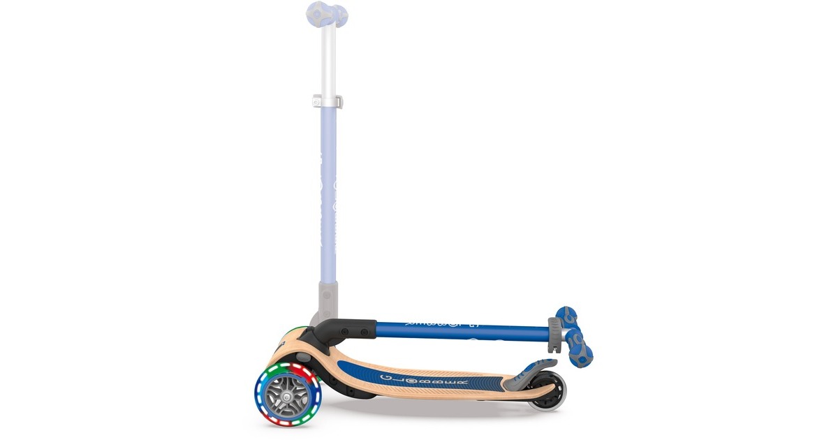 Der Primo Foldable Wood mit neuem Designkonzept bietet jede Menge Fahrspaß und ermöglicht einfaches Zusammenklappen. Der Lenker ist 3-fach höhenverstellbar zur optimalen Anpassung an das Kind. Durch die zuschaltbare Lenkeinrastung und die ergonomischen Handgriffe lässt sich einfach und sicher Fahren lernen. Ein weiteres Feature des Rollers sind die extra breiten Leuchtrollen. Das stabile Deck aus Birkenholz ist tiefer gelegt, so können leichter beide Füße aufgestellt werden. Das sorgt für optimale Kontrolle und erhöhten Komfort. Das Fahrwerk mit Kugellager ABEC 5 dient der optimalen Steuerung. Der Foldable Wood verfügt außerdem über eine besonders breite Hi-impact Reibungsbremse mit Speichenschutz sowie über super High Rebound gegossene PU Rollen in 120 mm und 80 mm.