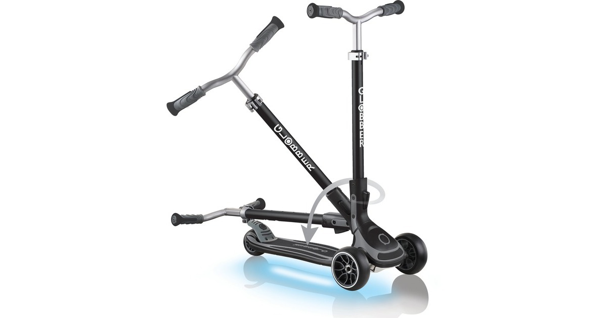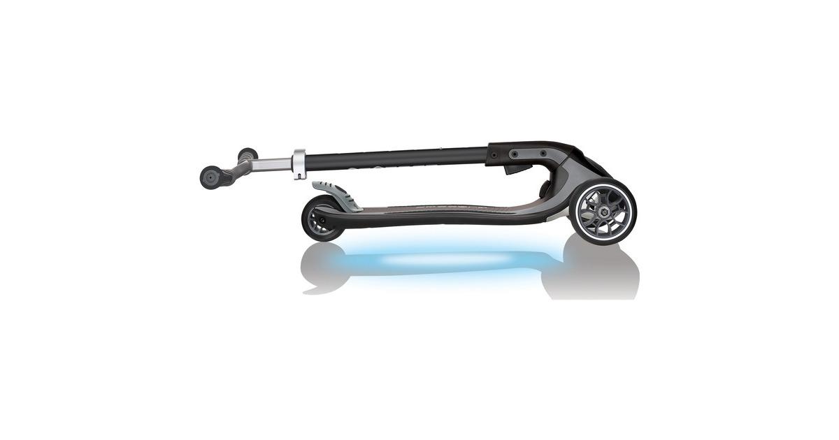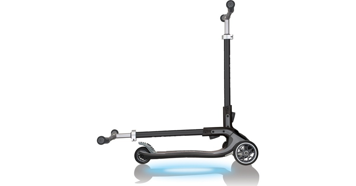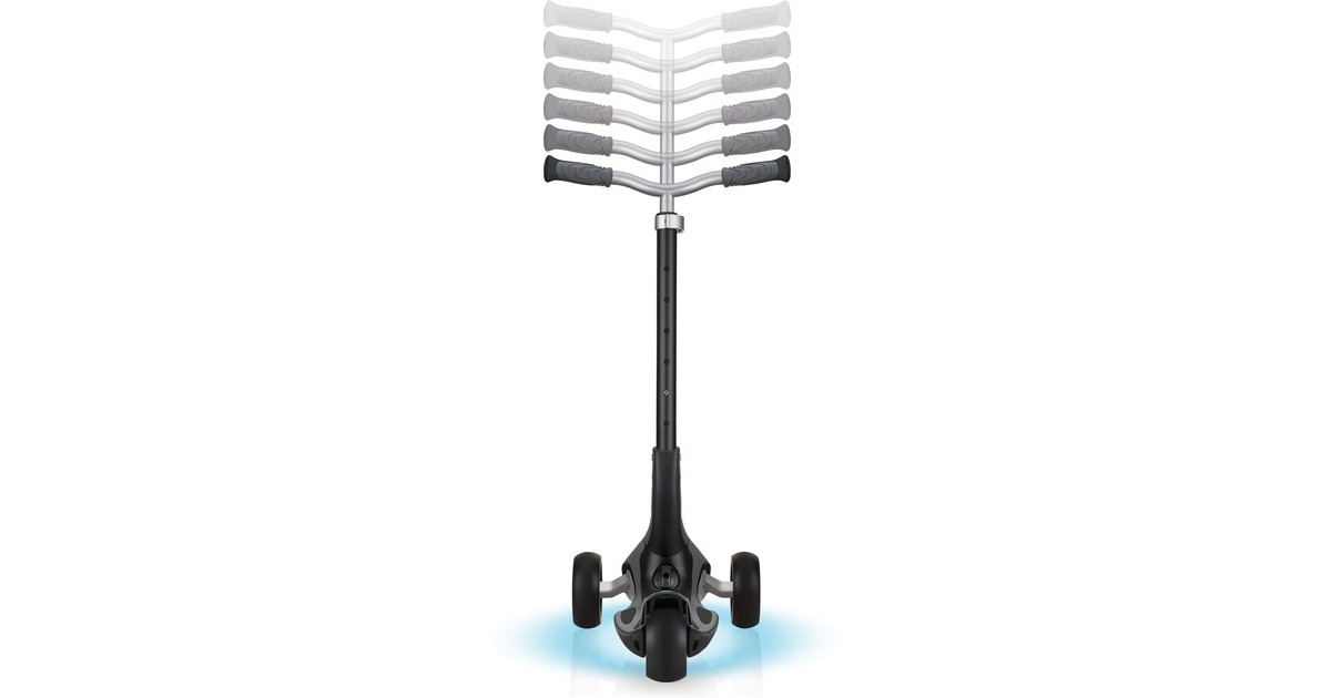 Hochwertiger Scooter mit patentiertem, elliptischem Klappmechanismus und Trolley-Modus, extra breite, gegossene PU-Rollen (2x vorne 125 mm, hinten 90 mm), High Rebound, Kugellager ABEC 7. Extra breite Bi-Injection Hinterradreibungsbremse mit Speichenschutz, patentiertes, per Drehknopf einstellbares Lenkwinkelsystem zur Veränderung des Kurvenradius. Extra breiter Lenker im BMX-Stil, ergonomische TPR-Griffe. Eloxierte Lenkstange aus Aluminium, 6-fach höhenverstellbar von 76 bis 101 cm, mit Schnellspanner und Sicherheitsarretierung. Deck mit Antirutsch-Trittfläche, integriertes, mehrfarbiges LED-Leuchmodul, 12 Leuchteinstellungen (aufladbar mit micro-USB-Kabel). |