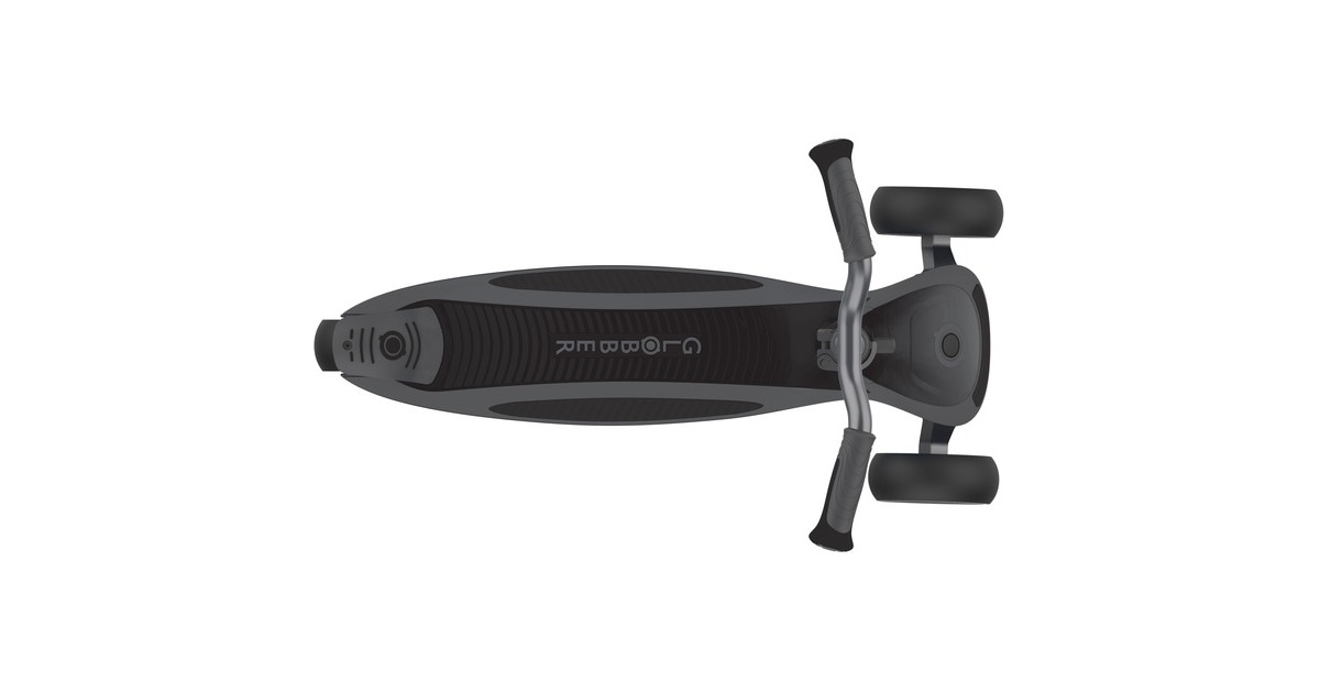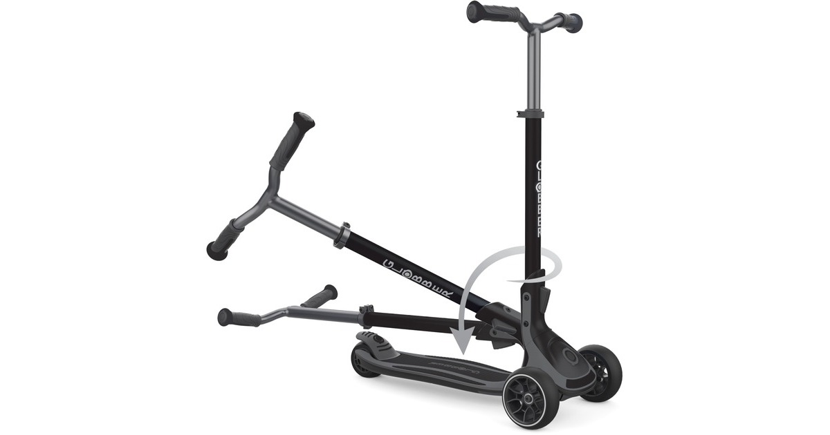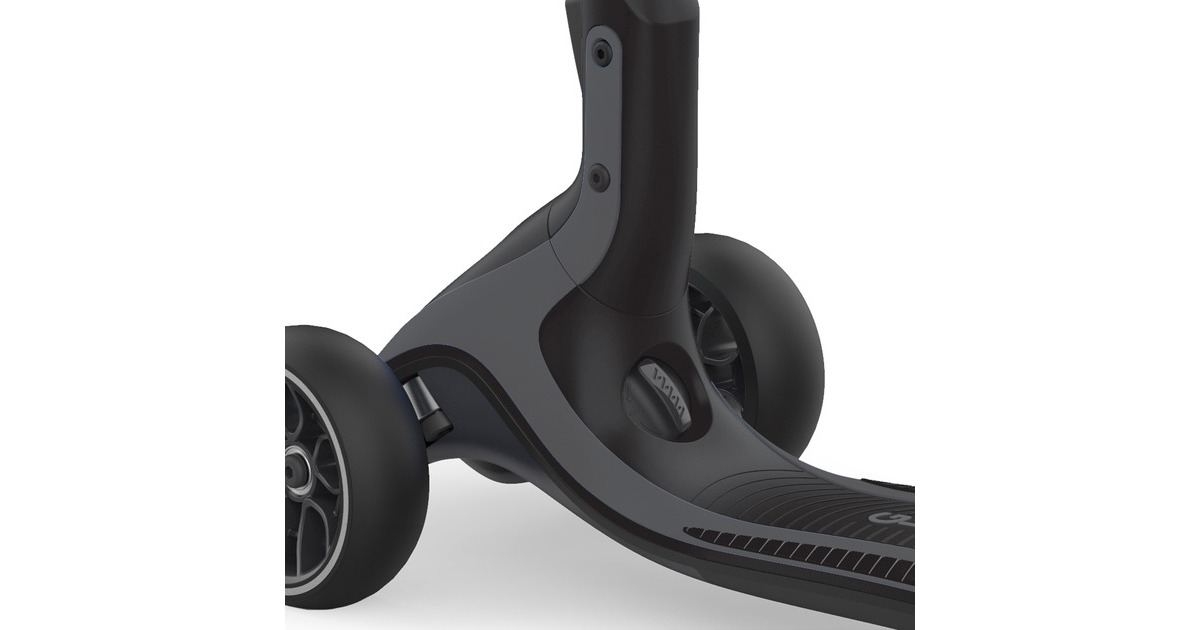 Aluminium T-Bar, zweifarbige TPR-Griffe, höhenverstellbar Lenker, TPR-Frontspoiler, PU Vorderräder in 125 mm mit ABEC 7 Kuegllager, PU Hinterraderrad 90 mm ABEC 7, ergonomische Bremse, patentiertes Faltsystem |