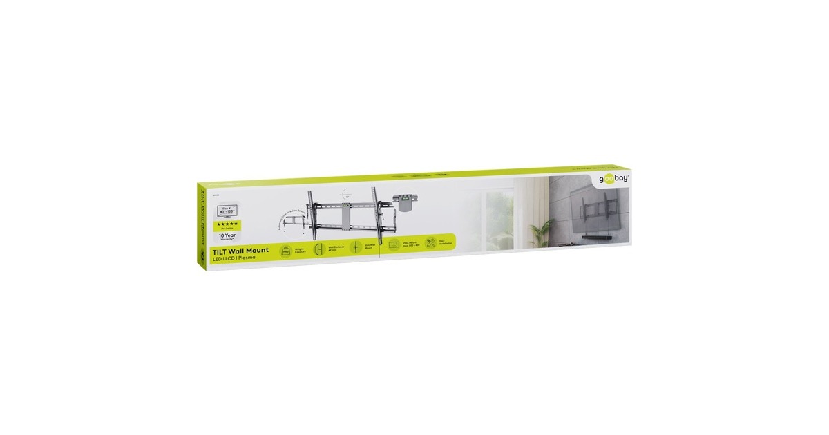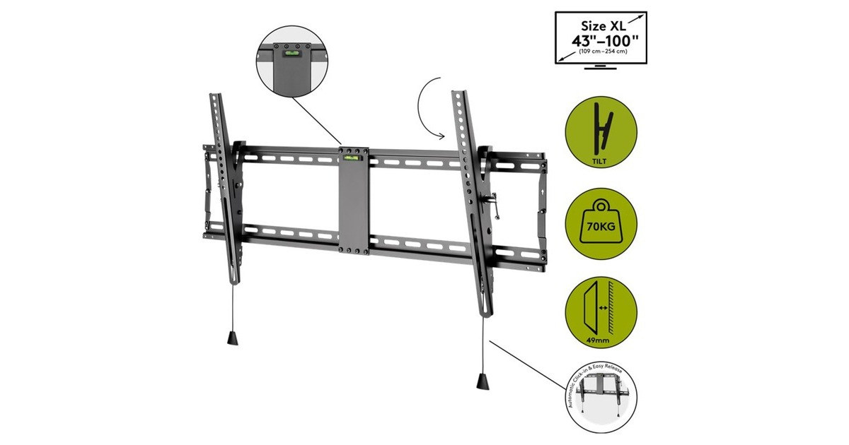 Die neigbare TV-Wandhalterung, die Fernseher mit einer Größe von 154 - 254 cm (60 - 100") Diagonale und einem Gewicht von 70 kg sicher halten kann. Sie kann von 3° bis 12° geneigt werden. Der automatisch einrastende Federverschluss mit leicht zu lösender Schnur sorgt für eine einfache und sichere Befestigung des Flachbildschirms an der Wand. Durch die seitliche Verschiebung kann der Fernseher auf der Wandplatte nach links und rechts bewegt werden, so dass er genau dort steht, wo man ihn haben möchte.Art.-Nr.: 1678382
