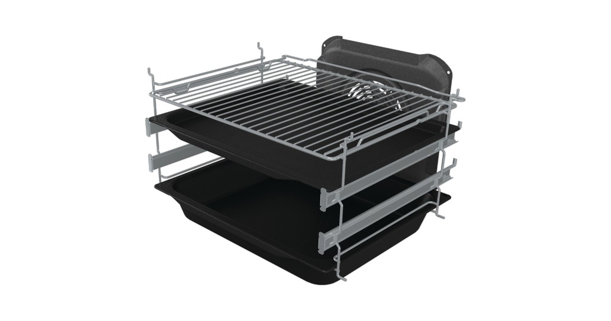 1 Backblech, 1 Fettpfanne, 1 Grillrost, 2fach Teleskopauszüge |