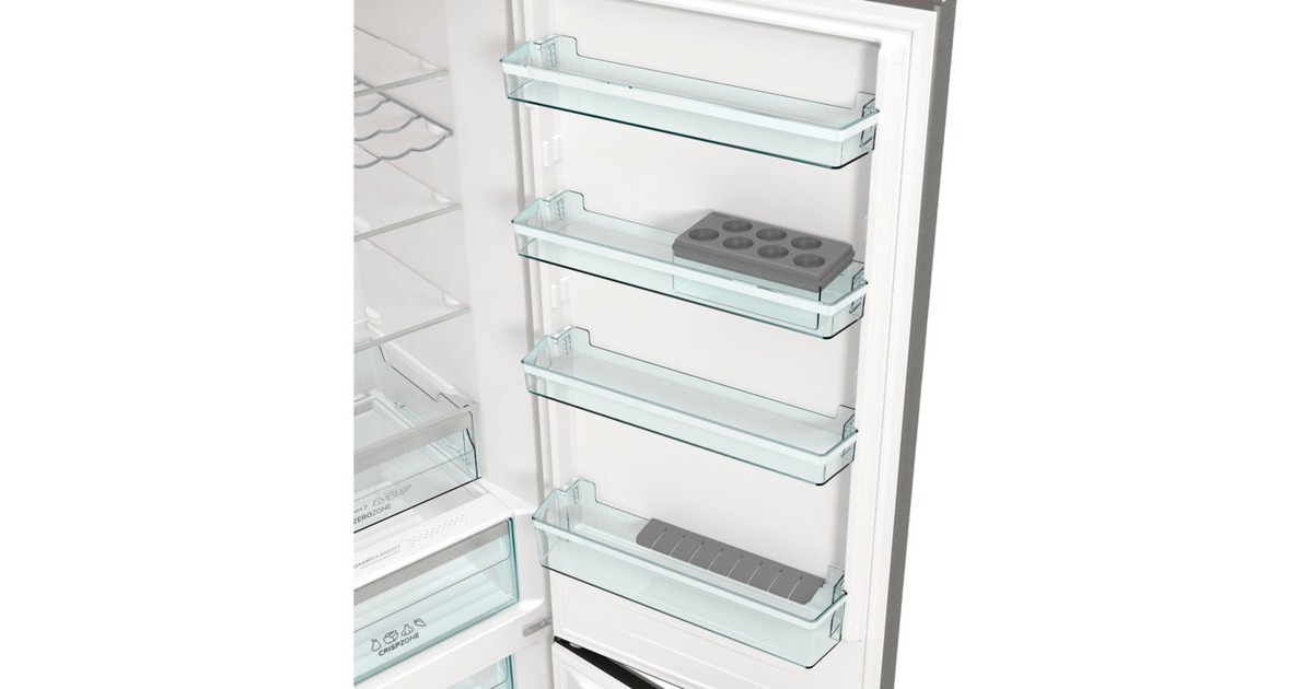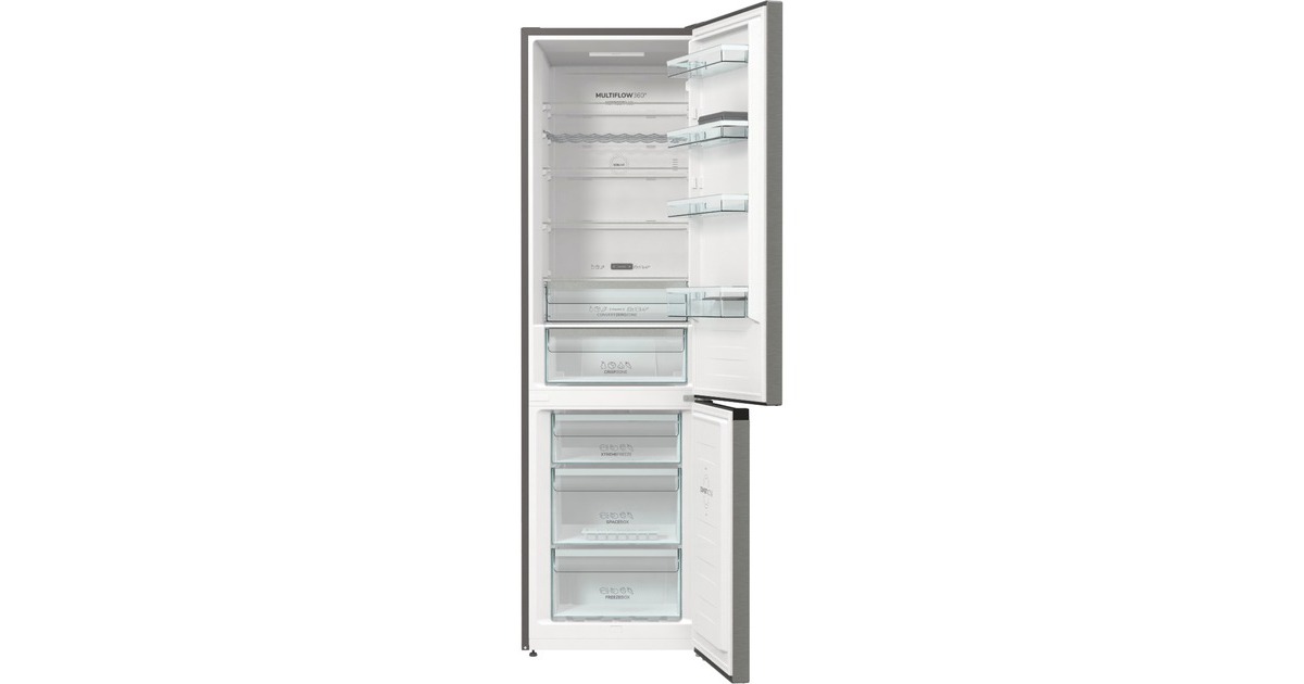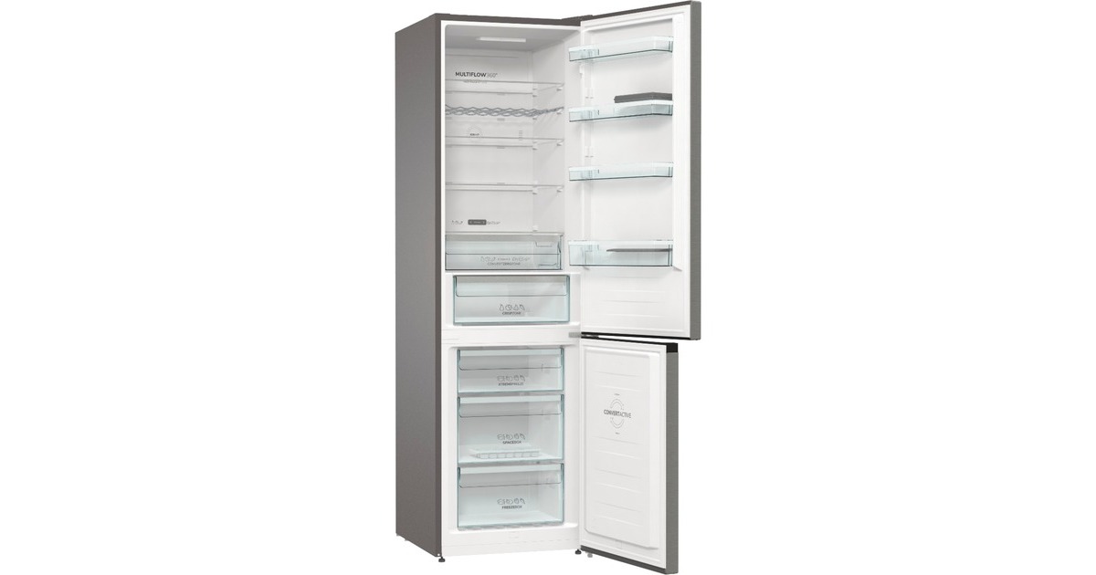 Die Kühl-/Gefrierkombination gorenje NRC6204SXL4 ist mit einem Gesamtnutzinhalt von 361 Litern ideal für den mittelgroßen Haushalt geeignet. Das 255 Liter umfassende Kühlteil stellt fünf Glasabstellflächen, eine CrispZone mit Feuchteregler, eine 26 Liter große Convert ZeroZone sowie vier Türfächer für die übersichtliche Lagerung frischer Lebensmittel zur Verfügung. Das Gefrierteil umfasst 106 Liter und ist mit drei Gefrierschubladen, davon ein XtremeFreeze-Schubfach, ausgestattet. NoFrost Plus verhindert im Gefrierteil vollständig die Eisbildung und hält somit auch den Energieverbrauch niedrig. Im Kühlteil sorgen IonAir und MultiFlow 360° für ein optimales Mikroklima und frische Lebensmittel dank der intensiven Zirkulation ionisierter Luft. Ein besonderes Feature der NRC6204SXL4 ist die ConvertActiv-Funktion, mit der man mit nur einem Knopfdruck das Gefrierfach zu einem Kühlfach oder zu einer großen ZeroZone verwandelt. Das intelligente AdaptTech-System hält eine konstante Temperatur im Kühlschrank aufrecht, unabhängig davon, wie oft man die Tür öffnet. Alle Einstellung sowie die Temperaturregelung erfolgt komfortabel über das außenliegende Display. Mit einem Stromverbrauch von 169 kWh im Jahr ist die NRC6204SXL4 in die Energieeffizienzklasse C eingestuft.Art.-Nr.: 1814996