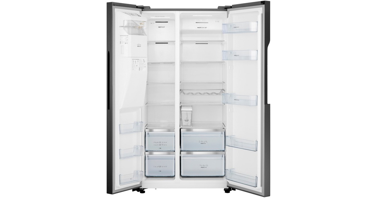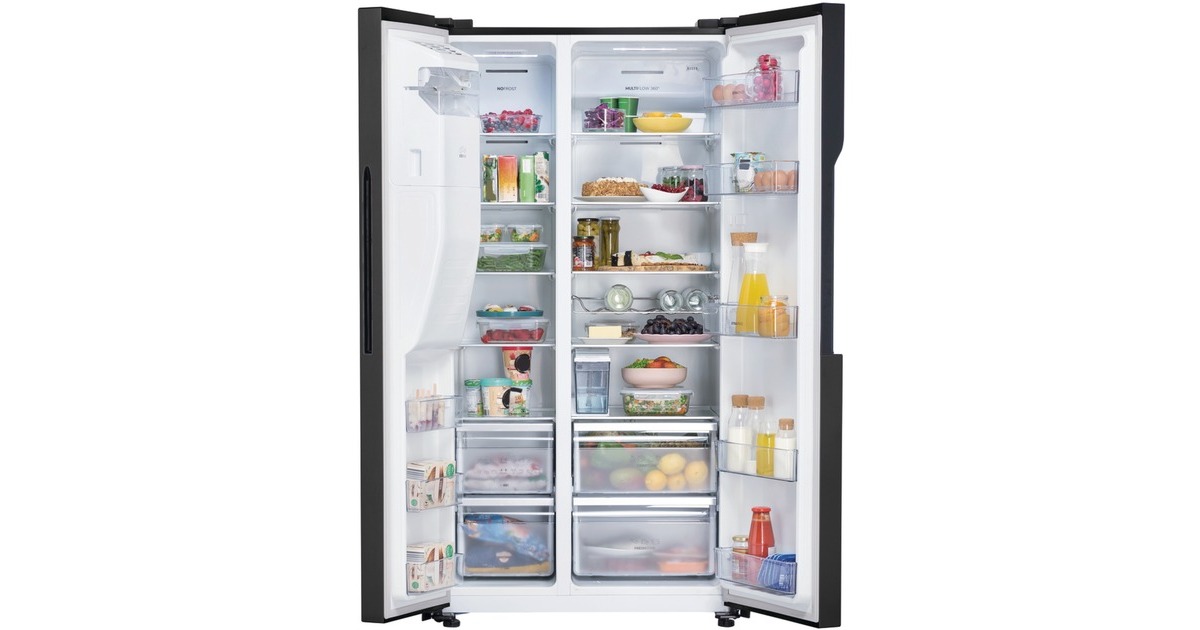 Der Side-by-Side gorenje NRS9EVB ist mit einem Gesamtnutzinhalt von 566 Litern ideal für den großen Haushalt geeignet und bietet jede Menge Komfort. Der 375 Liter umfassende Kühlbereich ist mit fünf Glasabstellflächen, einem FreshZone- und einem CrispZone-Schubfach sowie fünf Türfächern ausgestattet. Das MultiFlow-360°-Lüftungssystem verteilt die Luft gleichmäßig im Kühlraum, um eine optimale Luftzirkulation und beste Lagerbedingungen für die Lebensmittel zu bieten. Der Gefrierbereich stellt auf einem Nutzinhalt von 191 Litern ebenfalls fünf Glasabstellflächen, zwei Gefrierschubladen sowie drei Türfächer zur Verfügung und muss dank NoFrost Plus nie wieder mühsam abgetaut werden. Die FastFreeze-Funktion friert die Lebensmittel bei -24°C ein, um die meisten Mineralien in den Lebensmitteln zu erhalten, und mit dem EcoMode-Programm kann man sehr viel Energie sparen, wenn man für längere Zeit außer Haus ist. Die Temperaturregelung und Funktionssteuerung des NRS9EVB erfolgt bequem über das außenliegende LED-Display. Der berührungsgesteuerte IceMaker mit WaterDispenser verfügt über einen internen Wassertank, sodass man gekühltes Wasser, Crushed Ice und Eiswürfel genießen kann, ohne den Kühlschrank an die Wasserleitung anschließen zu müssen. Mit einem Stromverbrauch von 323 kWh im Jahr ist der NRS9EVB in der Energieeffizienzklasse E eingestuft.Art.-Nr.: 1868368