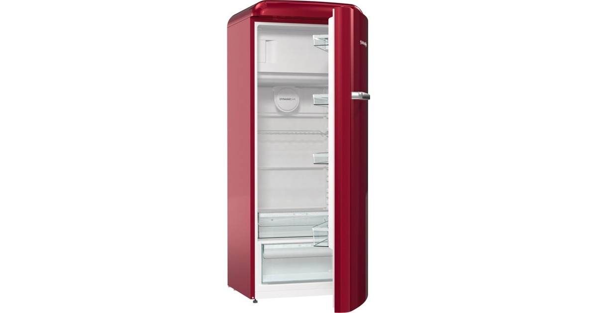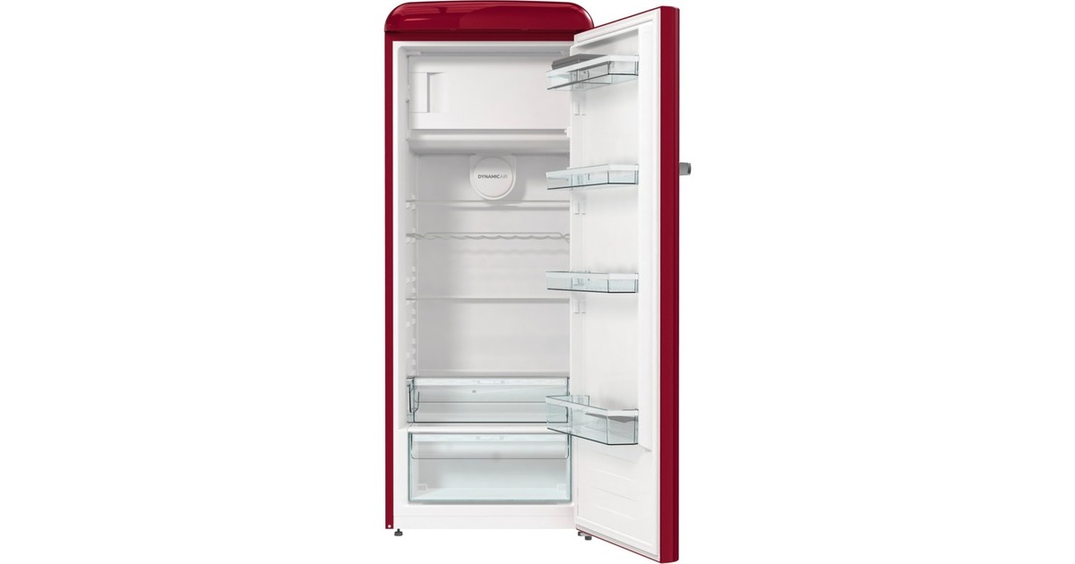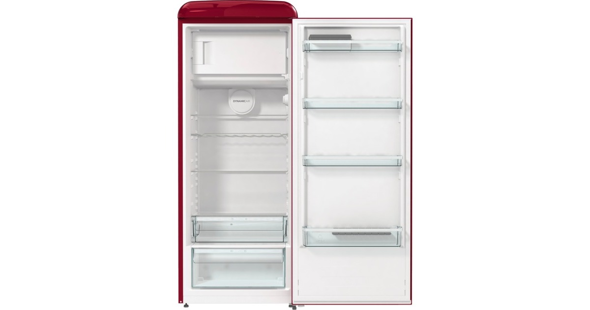 Der Kühlschrank gorenje ORB615DR bietet Gesamtnutzinhalt von 247 Litern und ist mit seinem Retro-Design ein echter Hingucker in der Küche. Ausgestattet ist er mit vier Glasabstellflächen, einem CrispZone-Schubfach für Obst und Gemüse und einem FreshZone-Schubfach für Fisch und Fleisch sowie vier Türfächern. Die LED-Innenbeleuchtung des ORB615DR bietet ausgezeichnete und höchst effiziente Lichtverhältnisse für eine gute Sicht auf die Speisen und das EcoMode-Programm spart viel Energie, wenn man für längere Zeit außer Haus ist. Das obenliegende 4-Sterne-Gefrierfach mit Klappe stellt einen Nutzinhalt von 22 Litern für Tiefkühlkost zur Verfügung und muss dank LessFrost-Technologie seltener abgetaut werden. Mit der Funktionen SuperCool und FastFreeze erreichen Lebensmittel noch schneller die gewünschte Temperatur. Mit einem Stromverbrauch von 126 kWh im Jahr ist der ORB615DR in die Energieeffizienzklasse D eingestuft.Art.-Nr.: 1905753