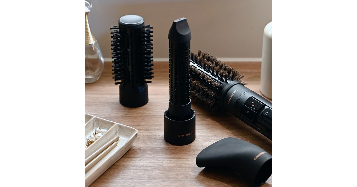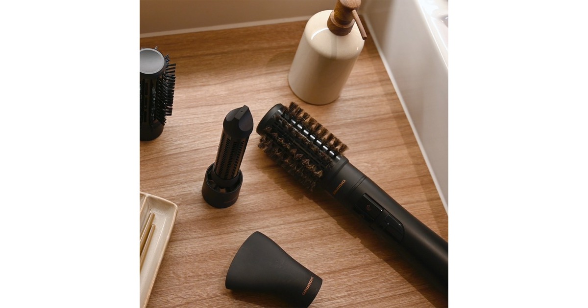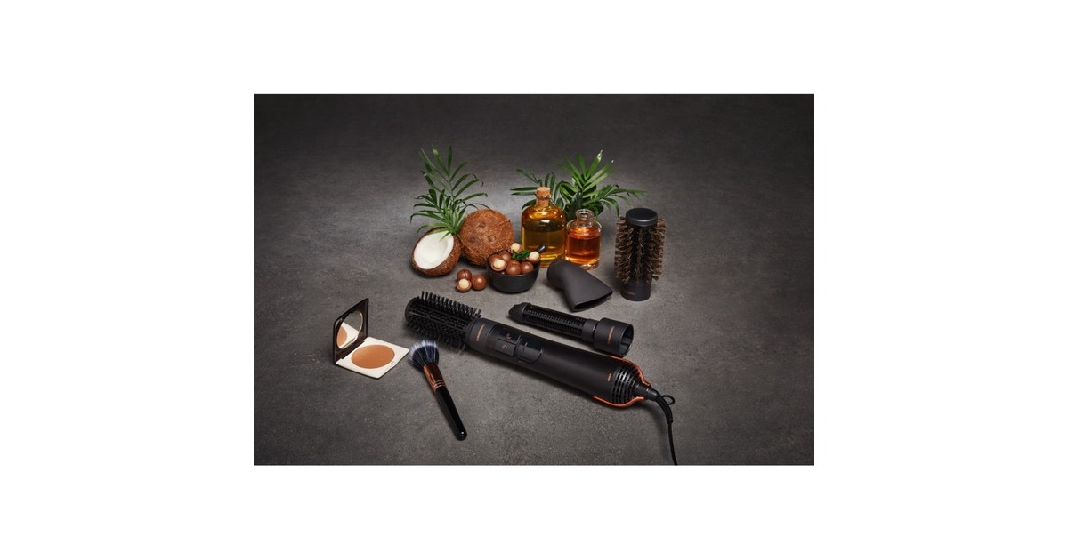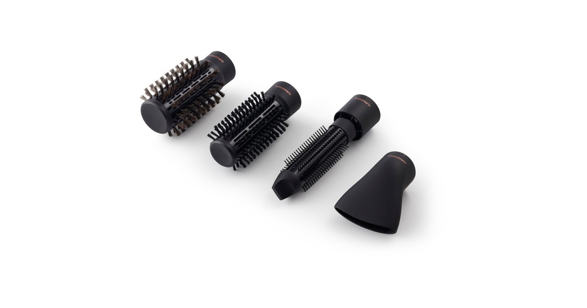 3 Thermobürstenaufsätze: Einziehbarer 30-mm-Aufsatz (Kleine Locken und Wellen), 40-mm-Aufsatz (Volumen und Medium-Locken), 50-mm-Aufsatz mit Naturborsten (Volumen, Maxi-Locken und Wellen); Stylingdüse zum Trocknen der Haare |