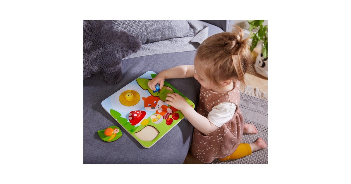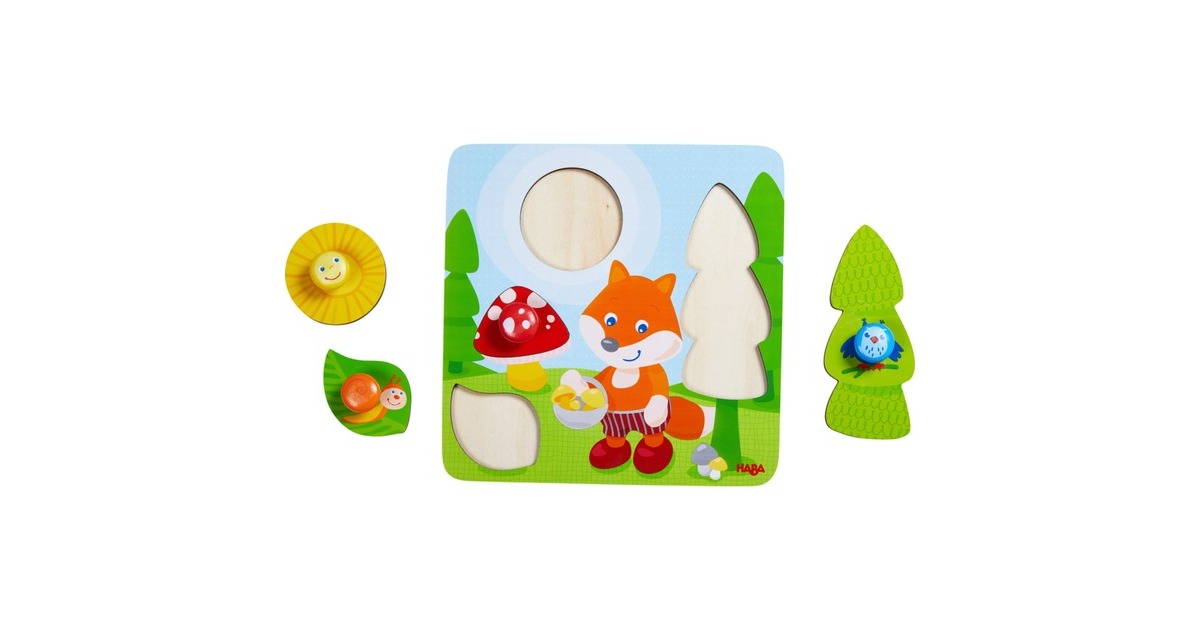 Das niedliche HABA Greifpuzzle Fuchs sorgt bereits bei den Kleinsten für extragroßen Puzzlespaß. Das liebevoll illustrierte Puzzlemotiv zeigt den Fuchs im Wald beim Sammeln von Pilzen, umgeben von anderen Waldbewohnern wie der Eule und der Schnecke. Auch die fröhlich strahlende Sonne ist zu sehen. Weil alle 4 Holzteile große bunte Knöpfe besitzen, sind sie für kleine Kinderhände leicht zu greifen. Brett und Teile des HABA Greifpuzzles Fuchs bestehen aus robustem Buchenholz und laden Babys ab 12 Monaten zum Entdecken von Farben und Formen ein.Art.-Nr.: 1731700