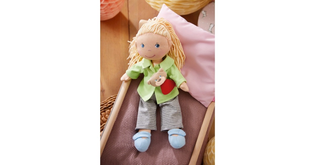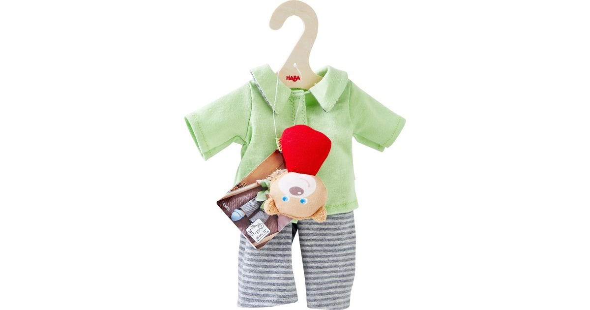 Dieses Kleiderset passt perfekt zu den HABA-Stoffpuppen mit einer Größe von 30 cm. Irgendwann müssen auch Puppen einmal schlafen. Und dafür gibt es dieses niedliche Kleiderset, das aus einem zweiteiligen Schlafanzug und einem Teddy-Kuscheltier besteht. Alle Teile sind bei 30° waschbar.Art.-Nr.: 1912755