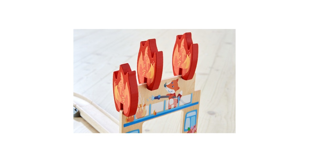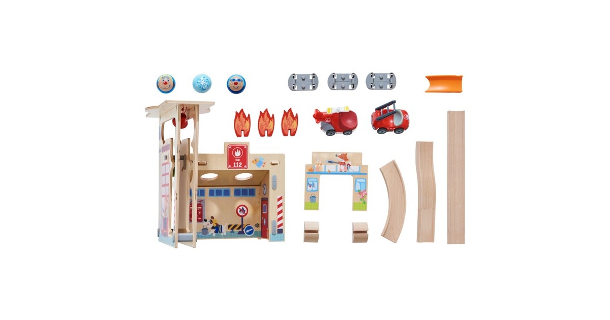 1 Feuerwehrwache, 1 Tor, 1 Feuerwehrauto, 1 Feuerwehrhubschrauber, 1 Kugel Hubschrauberpilot Hannes, 1 Kugel Feuerwehrmann Florian, 1 Rampe, 1 Gerade, 1 Kurve, 1 Abfahrtsrampe, 1 Kugel Wasser, 3 Feuersteine, 3 Verbindungselemente. Materialien: Buchenholz, Sperrholz, Kunststoff. Durchmesser der Kugeln: 4,6 cm. |