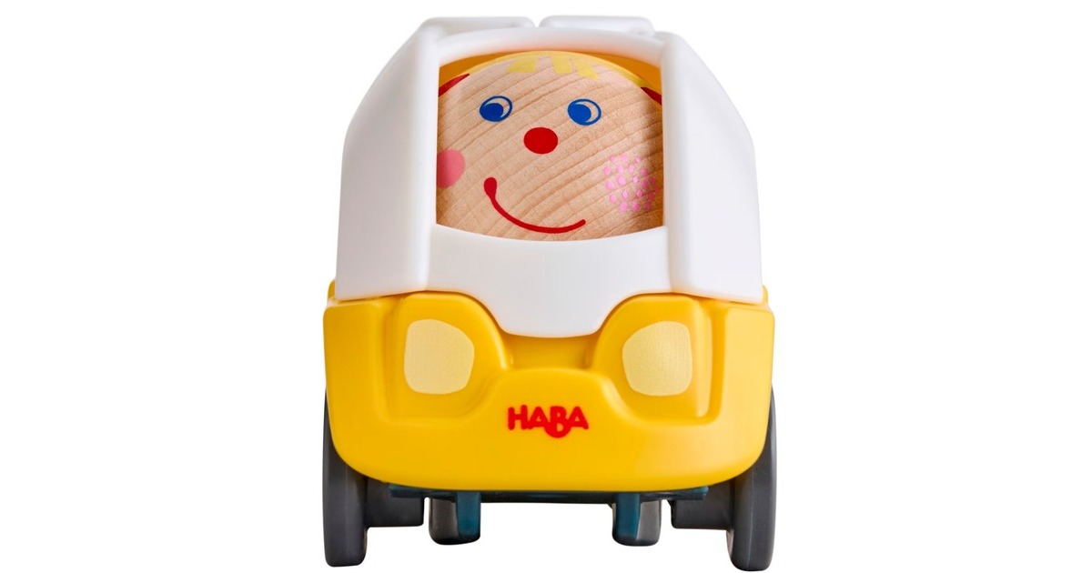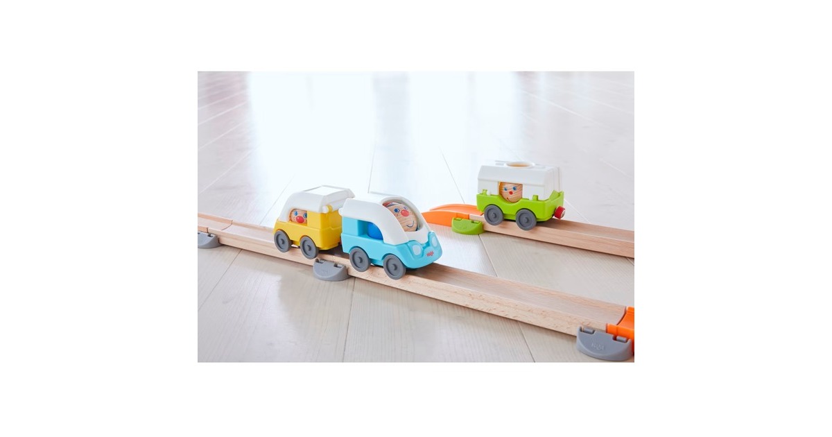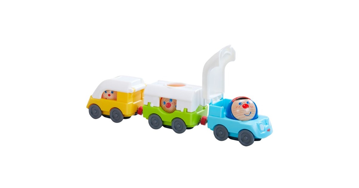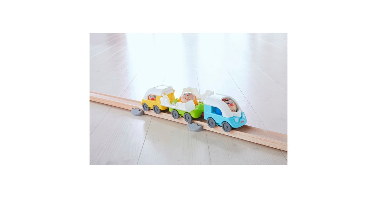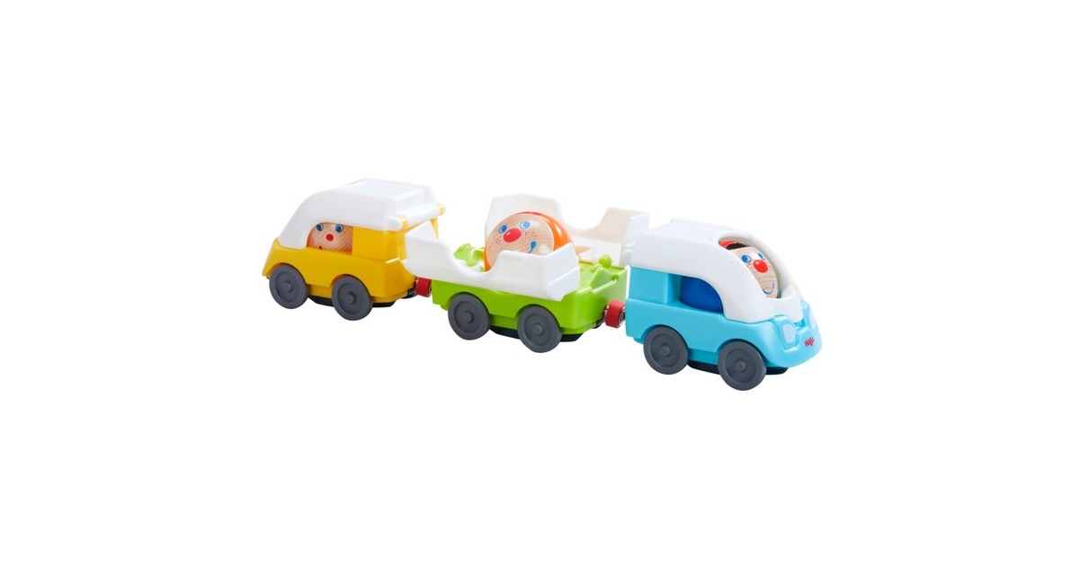 Der Kullerbü-Schnellzug fährt über die Schienen der HABA Spielbahnen. In den drei Wagen sitzen je eine Charakterkugel und gucken aus den Fenstern. Die Passagiere Peter, Pia und Patrik lieben das Zugfahren. Fürs Ein- und Aussteigen lassen sich die Dächer der Wagen ganz einfach aufklappen. Mit Magneten halten die Waggons aneinander. Ein kleiner Ruck genügt und der Zug kann mit anderen Kullerbü-Fahrzeugen mit Magnetkupplung kombiniert werden.