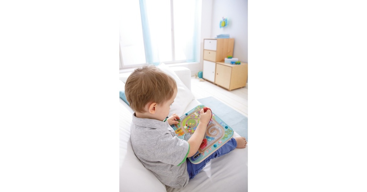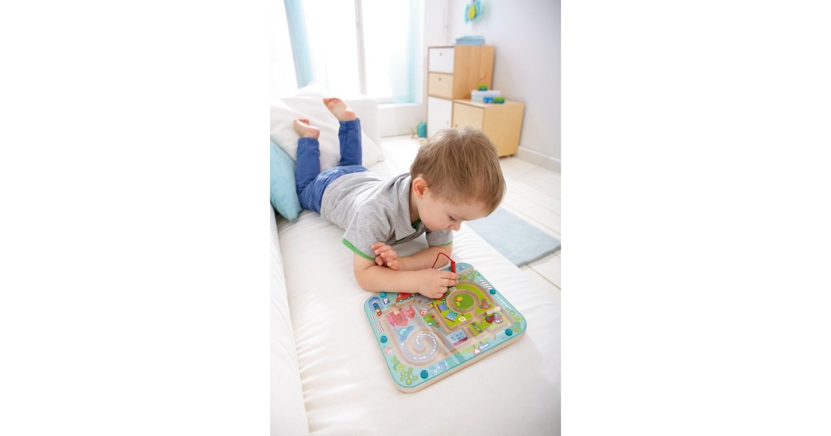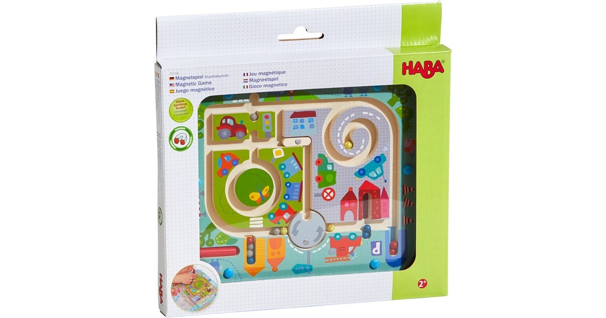 Beim Magnetspiel Stadtlabyrinth sind kleine Verkehrspolizisten gefragt: Die farbigen Kugeln sollen mit dem Magnetstab durch die Stadt auf die farblich passenden Parkplätze bewegt werden. Dabei ist in der Stadt ganz schön viel los. Wer darf zuerst durch den Kreisverkehr? Mit der Drehscheibe lässt sich das einfach regeln und mit dem Schiebestein eine Straße sperren. Wo kann man abbiegen und wie geht der Weg weiter? Aber Achtung! In der Stadt dürfen die Kugeln nicht zu schnell sein, sonst geht der Kontakt zum Magnetstift verloren und man muss von vorne beginnen. So werden spielerisch Konzentration und Feinmotorik trainiert.Art.-Nr.: 1361826