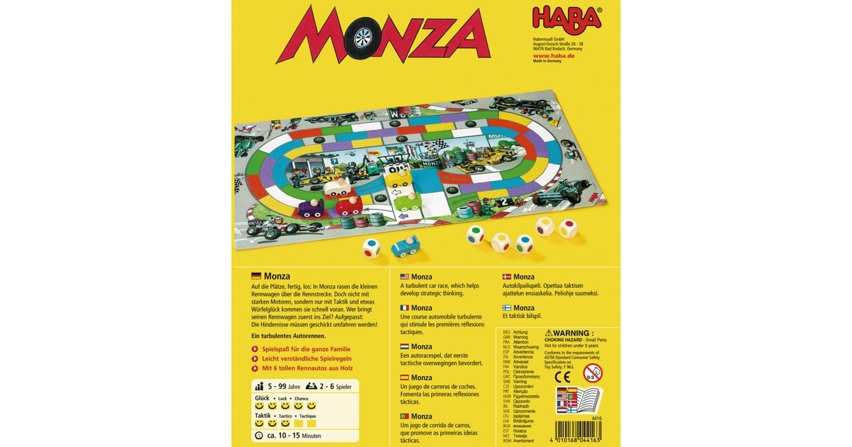 Monza ist ein rasantes Auto-Rennspiel von HABA für gewitzte Spieler. Sechs farbige Rennwagen aus Holz stehen am Start bereit für das große Rennen. Doch nur, wer die richtigen Farben würfelt und clever kombiniert, kommt besonders schnell vorwärts und gewinnt das aufregende Wettrennen. Monza ist ein erstes taktisches Kinderspiel – außerdem fördert es spielerisch das Erkennen und Benennen von Farben durch die sechs farbigen Würfel. Dank leicht verständlicher Spielregeln eignet sich das turbulente Farbenrennen für die ganze Familie. Also in die Rennwagen, fertig und los … !Art.-Nr.: 1362748