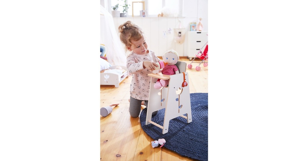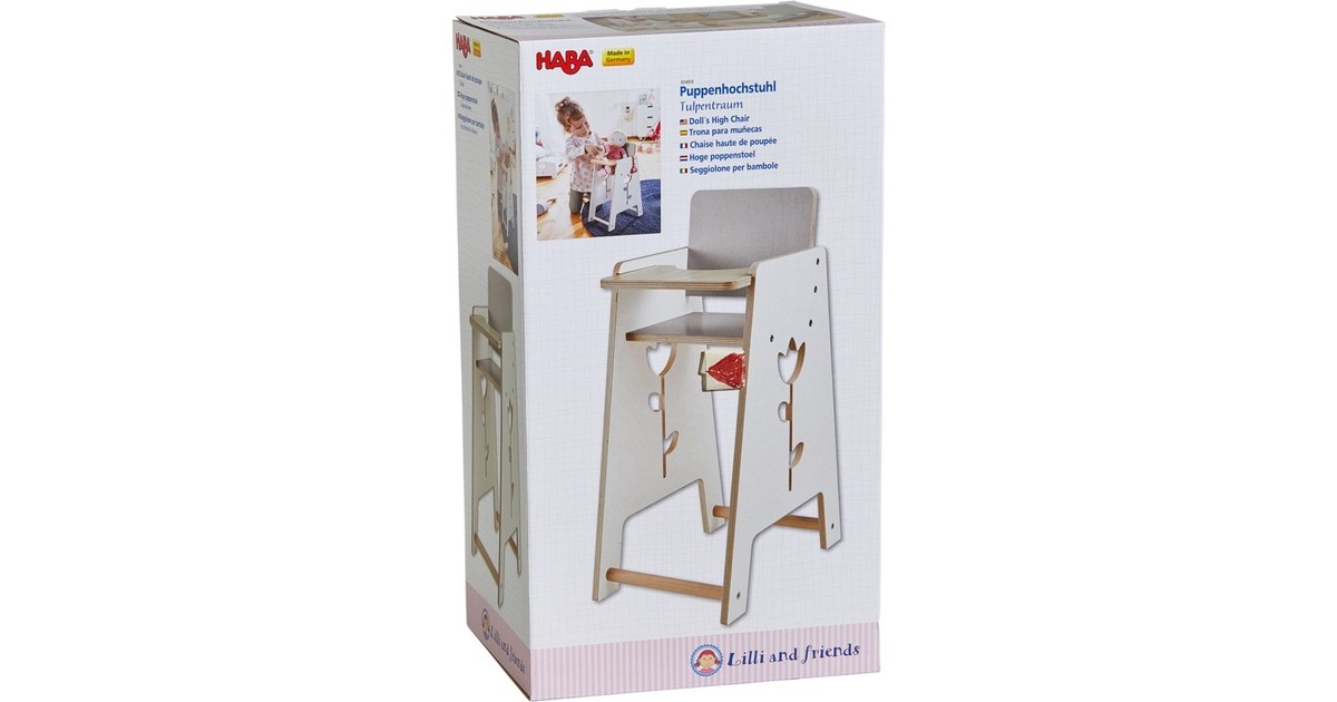 Eine Bereicherung für jedes Eltern-Kind-Rollenspiel ist der hübsche HABA-Puppenhochstuhl Tulpentraum. An seiner Tischfläche können junge Puppeneltern ab 18 Monaten ihren Liebling füttern und ihrer Fantasie dabei freien Lauf lassen. Im Spiel werden auch feinmotorische Fähigkeiten und soziales Verhalten trainiert. Mit seinem Tulpendekor sieht der Puppenhochstuhl zudem traumhaft schön aus und macht eine gute Figur in jedem Kinderzimmer. Dank seiner robusten Verarbeitung aus Sperrholz und Buche verspricht er langes Spielvergnügen. Der Puppenhochstuhl passt optisch zu allen weiteren Puppenmöbeln aus der HABA-Reihe Tulpentraum und eignet sich für jede HABA-Puppe egal welcher Größe.Art.-Nr.: 1731232