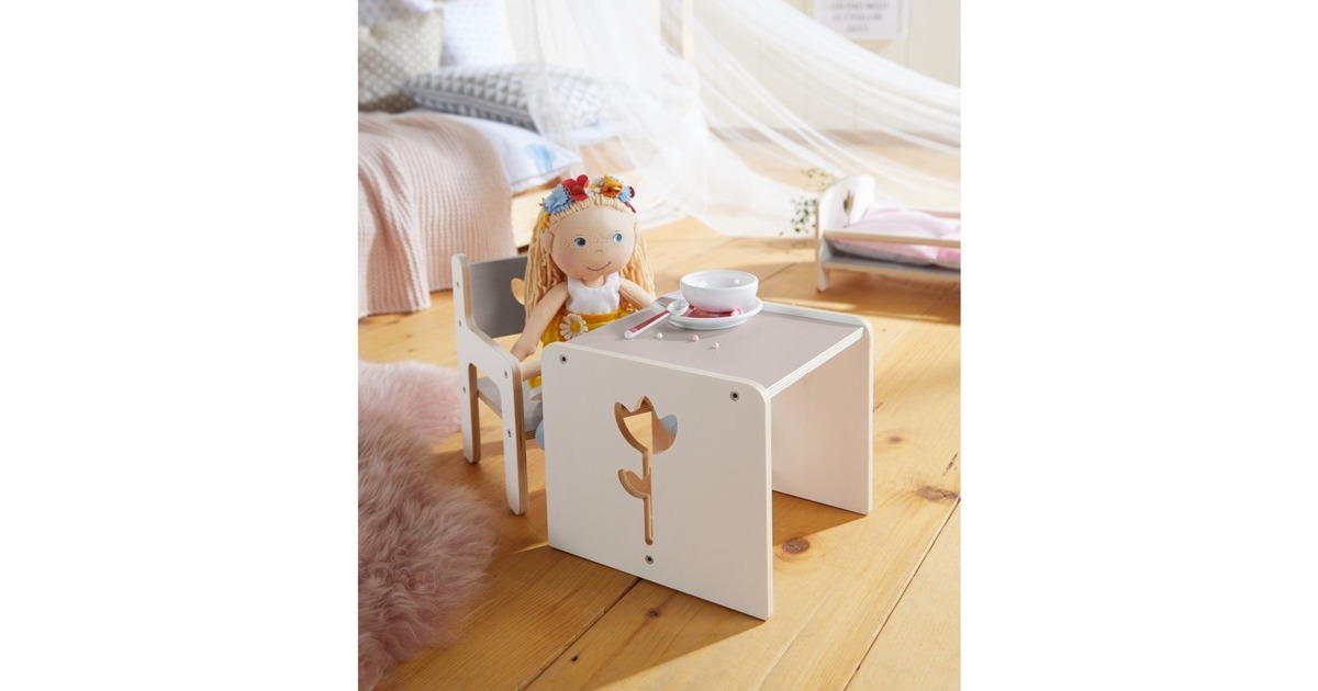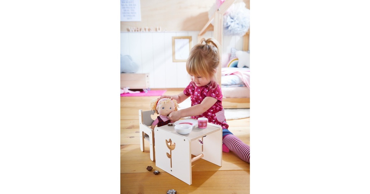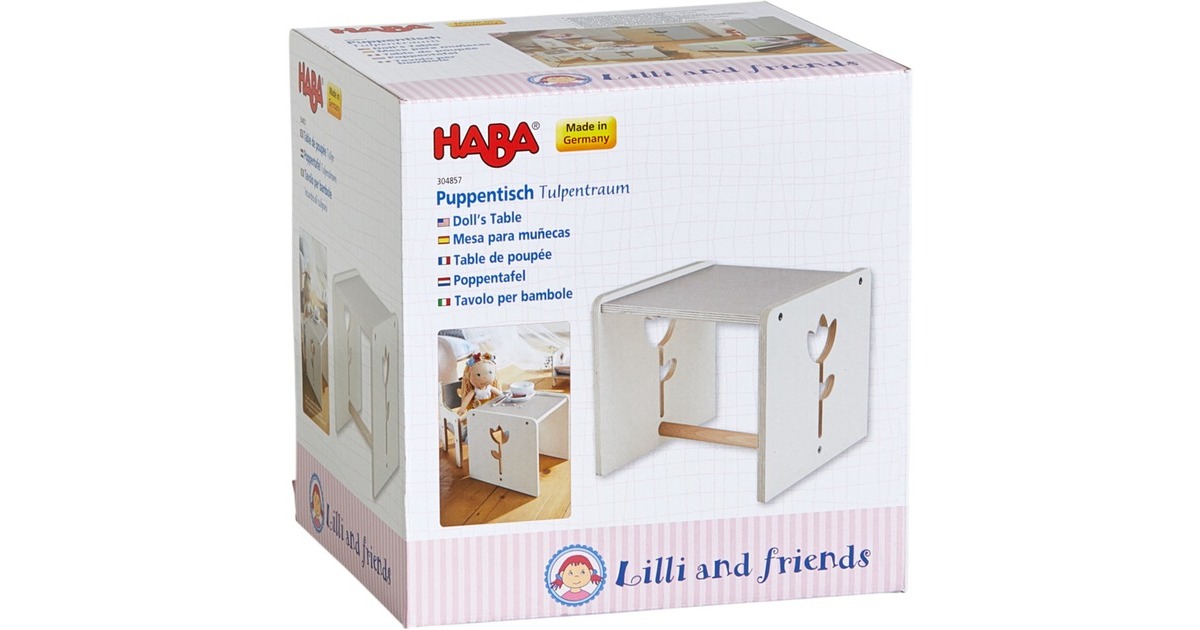 „Das Essen ist fertig!“ Puppen nehmen an dem hübschen HABA-Puppentisch Tulpentraum gerne Platz, denn er sieht mit seinem Tulpendekor einfach wunderschön aus. Die Tischplatte ist groß genug für Puppengeschirr wie Tassen, Teller und Schüsseln. Bei ihren Rollenspielen können junge Puppeneltern ab 18 Monaten ihrer Fantasie einfach freien Lauf lassen. Nebenbei werden feinmotorische Fähigkeiten und soziales Verhalten trainiert. Der Puppentisch ist aus Sperrholz und Buche robust verarbeitet und sorgt für lange Spielfreude. Er passt optisch zu allen weiteren Puppenmöbeln aus der HABA-Reihe Tulpentraum und eignet sich für jede HABA-Puppe egal welcher Größe.Art.-Nr.: 1731227