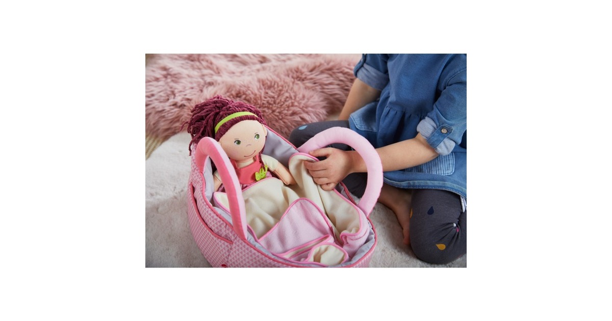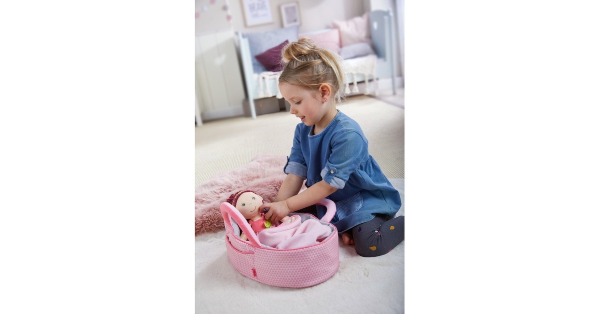 Die Lieblingspuppe soll mit zu den Großeltern oder zu den Freunden? Ausflüge und Reisen sind mit der Puppentragetasche Rosarot von HABA ein besonders angenehmes Vergnügen. Einfach die Puppe in das rosarote Kuschelnest legen und mit der weiche Decke zudecken. So hat es die Puppe schön gemütlich! Dank der gut greifenden Tragegriffe und des geringen Gewichts lässt sich die Tasche leicht überallhin mitnehmen. Auch als Puppenbett für daheim eignet sich die HABA-Puppentragetasche Rosarot wunderbar, denn sie ist ein hübscher Schlafplatz für den Liebling und beschert ihm süße Träume. Die Tragetasche ist daher eine tolle Geschenkidee für alle Puppeneltern!Art.-Nr.: 1574683