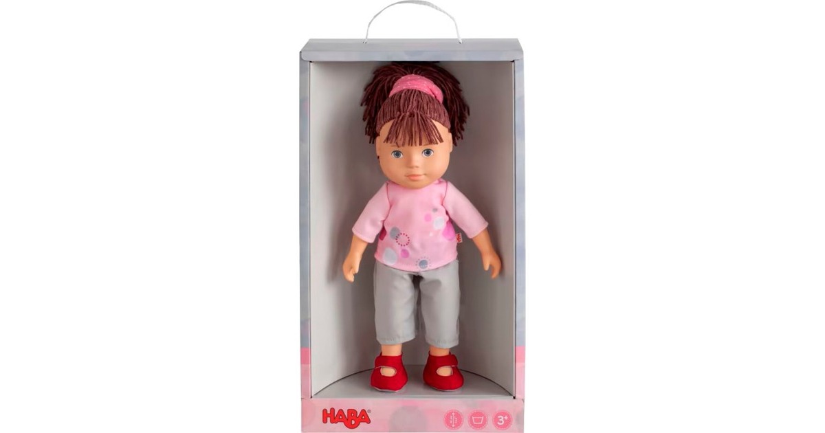Lya ist eine hübsche Spielpuppe für Kinder ab 3 Jahren. Ihr kann gekämmt und frisiert werden. Mit ihrer bequemen Kleidung in rosa und grau mit roten Schuhen ist sie für die verschiedensten Abenteuer gut gestylt. Die KIeidung ist dank der Klettverschlüsse auch für Kleinkinder leicht zu wechseln und bis 30° waschbar. Auch die Schuhe können ausgezogen werden. Der weiche Körper dieser Puppe besteht aus robustem Vinyl.Art.-Nr.: 1913194
