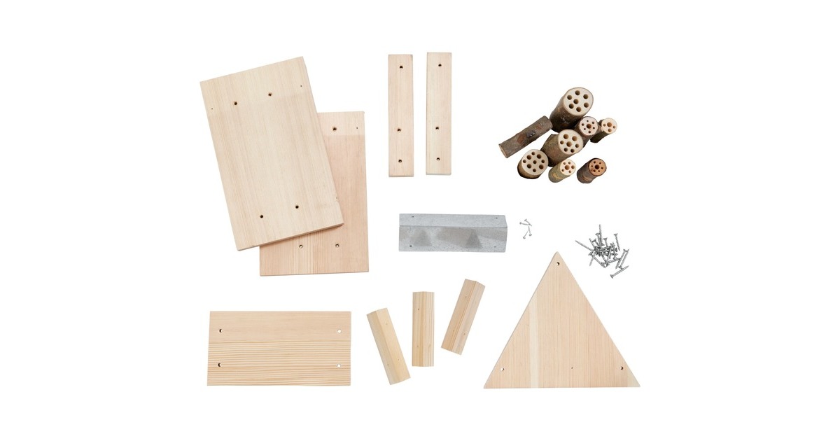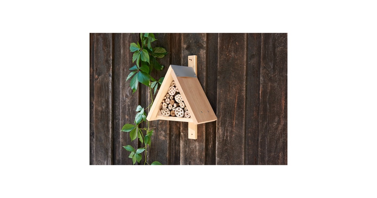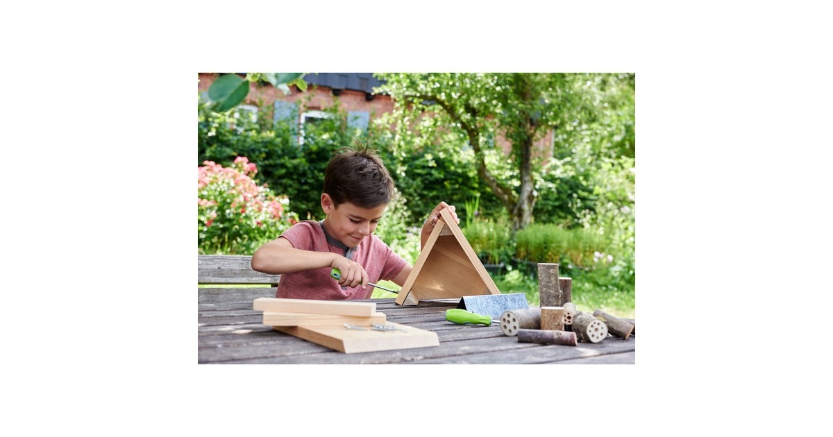 Hier finden nützliche Fluginsekten einen geschützten Platz für ihre Eiablage. Der „Rohbau“ des Hotels ist im Handumdrehen fertig, denn dafür müssen nur die Holzteile miteinander verschraubt werden. Ein Blech schützt vor Nässe im Giebelbereich. Für den Innenausbau sind 8 vorgebohrte Äste enthalten, das restliche Füllmaterial dürfen die Kinder selbst in der Natur suchen.Art.-Nr.: 1527029