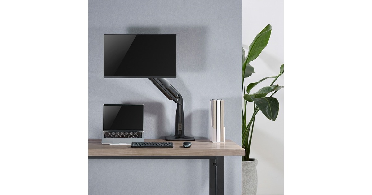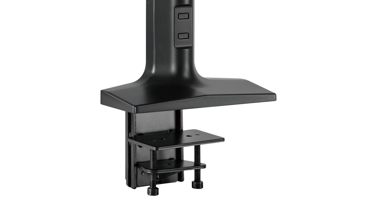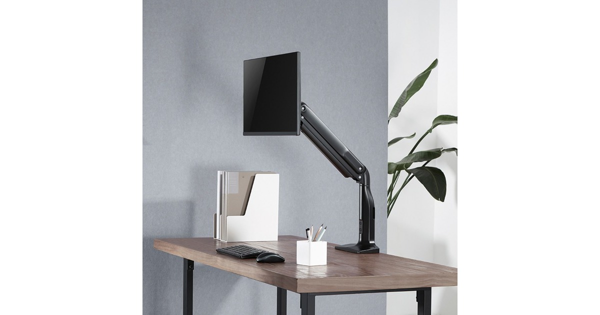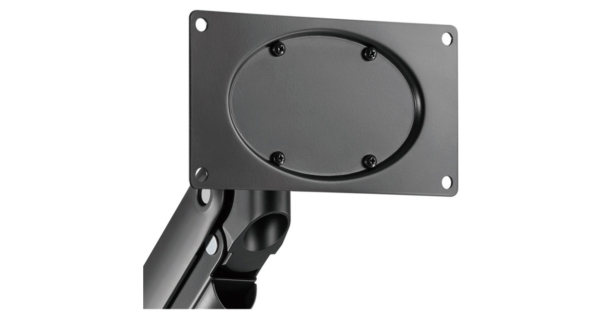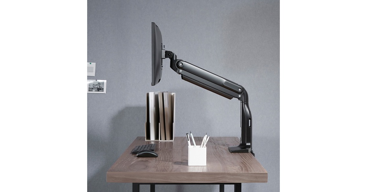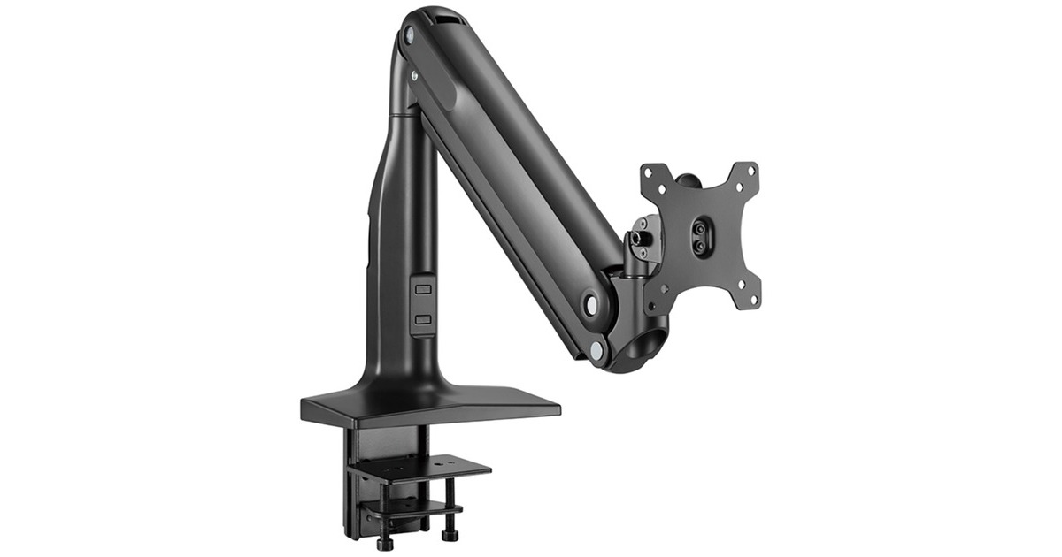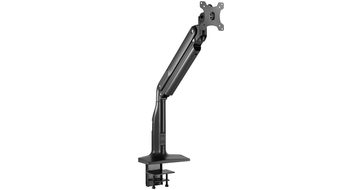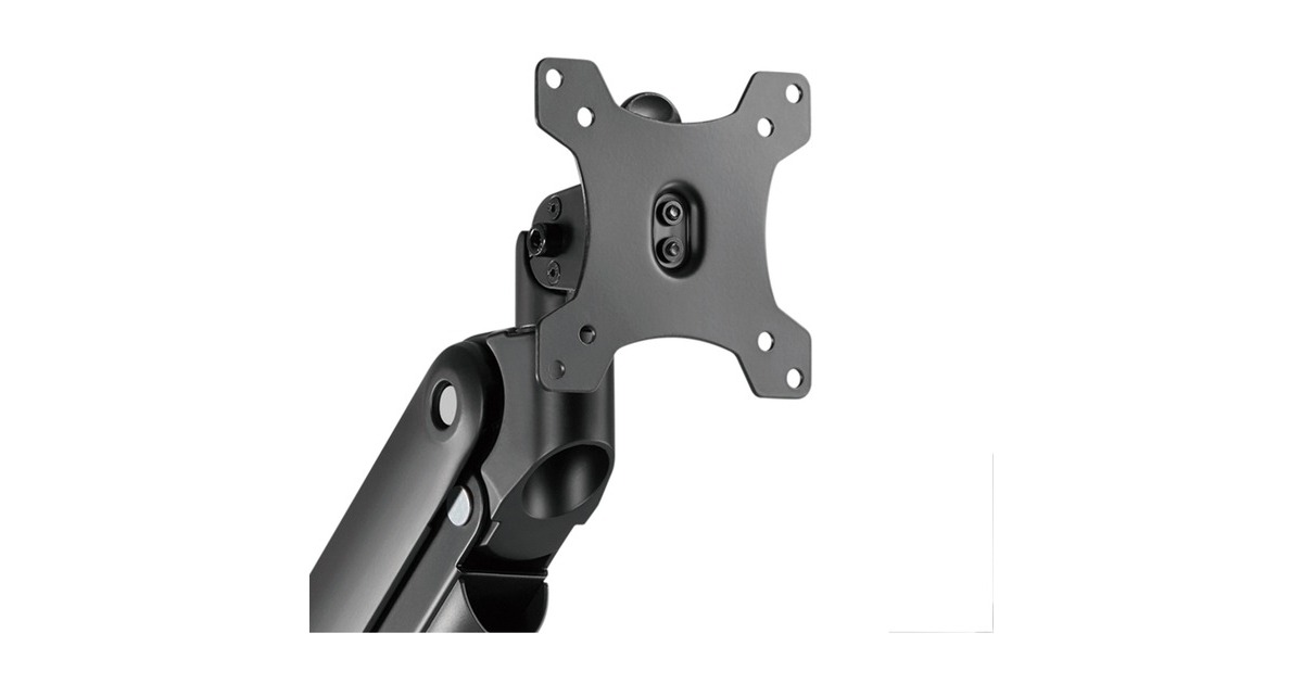 einen Monitor von 43 - 109 cm (17 - 43″) . Die Konstruktion ist aus hochwertigem, langlebigem Aluminium gefertigt. Durch extrem leichtgängige und auf das Gerätegewicht einstellbare Gasfederungen zudem vollbeweglich. Der Monitor lässt sich dadurch mühelos, nahezu schwebend, nur mit der Fingerspitze in jede gewünschte Position bringen. Der Neigungswinkel ist mit ± 45° variabel einstellbar. Zusätzlich ist eine stufenloser Wechsel der Bildschirmausrichtung möglich. Die VESA-Universalaufnahme kann mit 75 x 75 und 100 x 100 mm bestückt werden. Die Kabel der verbauten Komponenten können entlang der Schwenkarme verlegt und mit Clips sauber fixiert werden. Wahlweise ist eine Klemm- oder Schraubmontage