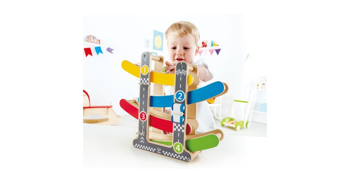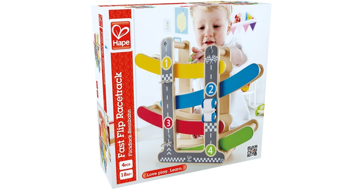 Die Flickflack-Rennbahn ist aus Holz und verfügt über vier Etagen. Auf die Oberste lassen sich zwei Holzautos setzen, die dann in einer rasanten Fahrt die anderen Stockwerke herunter sausen. Dabei überschlagen sie sich mehrmals. Das Holzspielzeug eignet sich für Kinder ab 18 Monate und sorgt für Rennspaß im Kinderzimmer.Art.-Nr.: 1629958