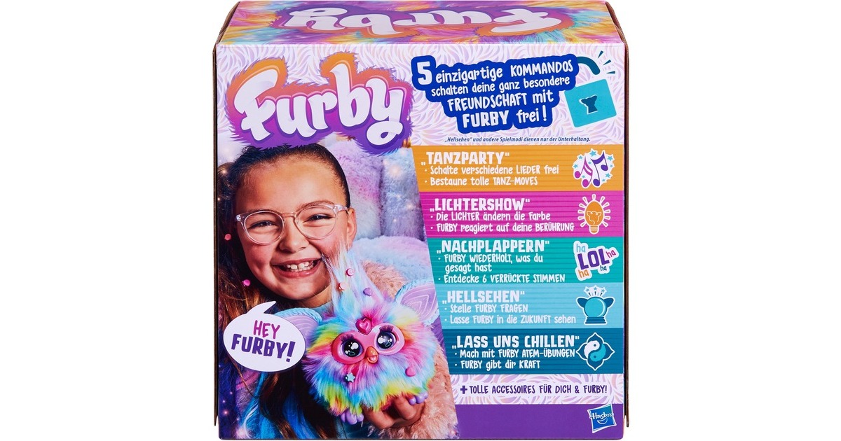 Hier kommt Furby! Dieses niedliche kleine Wesen ist ein interaktiver Spielzeugfreund mit 5 Modi, die durch Stimme aktiviert werden. Mit über 600 Sätzen, Witzen, Liedern und mehr lädt Furby zum Spielen ein. Mit 5 gesprochenen Kommandos an Furby wechselt er in den entsprechenden Spielmodus: Tanzparty, Nachplappern, Hellsehen, Lass uns chillen und Lichtershow. Furby reagiert, wenn er umarmt, sein Kopf gestreichelt, er geschüttelt oder mit seinem eigenen Pizza-Anhänger (oder dem Finger) gefüttert wird. Je mehr ein Kind mit ihm spielt, desto mehr Spaß wird freigeschaltet! Furby kann liebevoll umsorgt werden, indem er gefüttert und gekämmt wird. Dann kann er mit den ansteckbaren Perlen gestylt werden und sogar tolles Modezubehör kann für seinen Besitzer gestaltet werden. Das elektronische Plüschspielzeug eignet sich für Mädchen und Jungen ab 6 Jahren und ist ein lustiger Begleiter für Kinder, um ihn stets an der Seite zu haben. Furby würde sagen: „Dah-noh-lah“ (Party-Zeit)! Art.-Nr.: 100036934