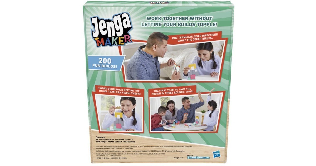 Bildet Teams, beginnt mit dem Bau und liefert euch ein Rennen um die Krone. Das Jenga Maker Spiel ist eine spannende, lustige Edition des klassischen Jenga Spiels. Die Spieler bilden Teams und versuchen, vor den Anderen ihr Jenga Objekt mit den Jenga Hartholz-Klötzen fertigzustellen. Ein Teammitglied beschreibt das auf der Karte abgebildete Bauwerk. Die Anderen versuchen, dieses anhand der Beschreibung so schnell wie möglich zu vollenden und zu krönen. Aufgepasst! Wenn ein Team das Bauwerk falsch baut oder das Objekt einstürzt, muss es von vorne beginnen. Das erste Team, das 3 Bauwerke fertigstellt und krönt, hat gewonnen. Es ist ein lustiges, anspruchsvolles Spiel, bei dem Freunde, Fähigkeiten, Spannung, Spaß und etwas Glück kombiniert werden. Auf der Suche nach einem tollen Spiel für einen Familien-Spieleabend? Die Bauwerke für Anfänger und Fortgeschrittene machen Jenga Maker zu einem idealen Spiel für Erwachsene und Kinder ab 8 Jahren.Art.-Nr.: 1824970