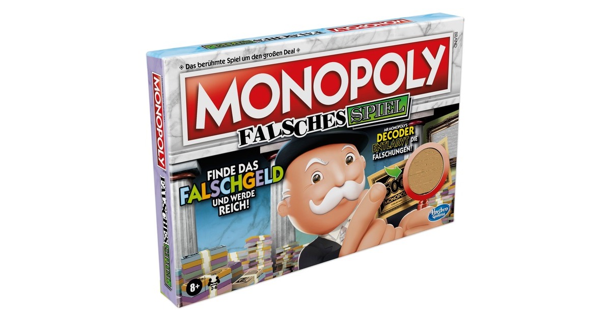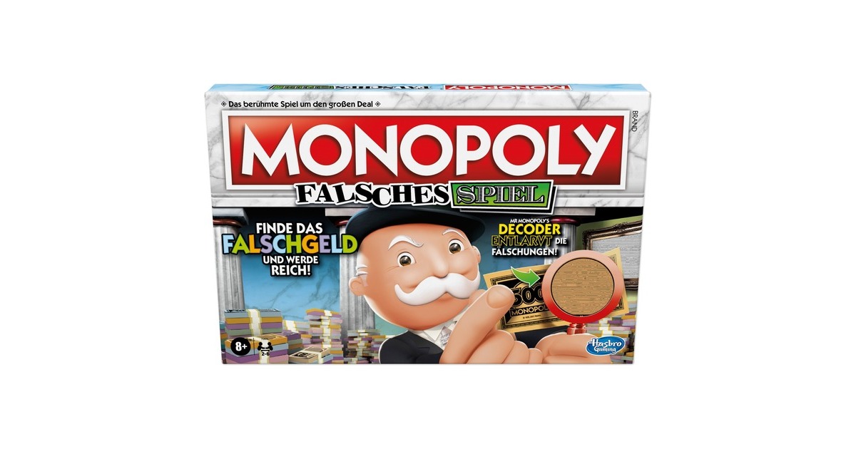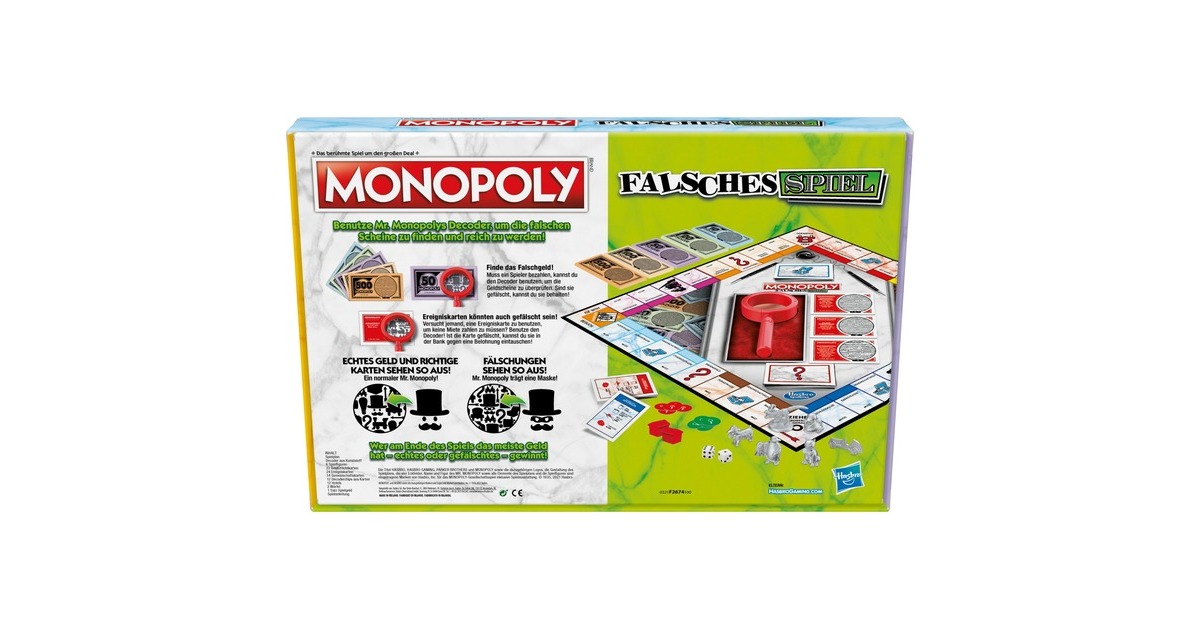 Bei Monopoly Falsches Spiel ist nicht immer alles so, wie es scheint, denn es hat jemand Falschgeld und gefälschte Ereigniskarten in das Spiel gemischt! Zum Glück verleiht Mr. Monopoly gern seinen Decoder, damit die Spieler die Fälschungen entdecken und trotzdem reich werden können. Ein spannendes Spiel, bei dem es viel zu entdecken gibt, wenn die Spieler ihre Gegner durch die Nutzung des Decoders mit Falschgeld erwischen. Hierfür werden Decoder-Chips benutzt, die jedoch mit Bedacht eingesetzt werden sollten, denn es gibt nur wenige. Der Spieler mit dem meisten Geld am Spielende – egal ob es gefälscht ist oder nicht – gewinnt! Dieses Familienspiel sorgt für jede Menge Abwechslung. Eine hervorragende Wahl für Spieleabende und als Aktivität zu Hause für Kinder ab 8 Jahren. Enthält beliebte Monopoly-Spielfiguren. Art.-Nr.: 1771693