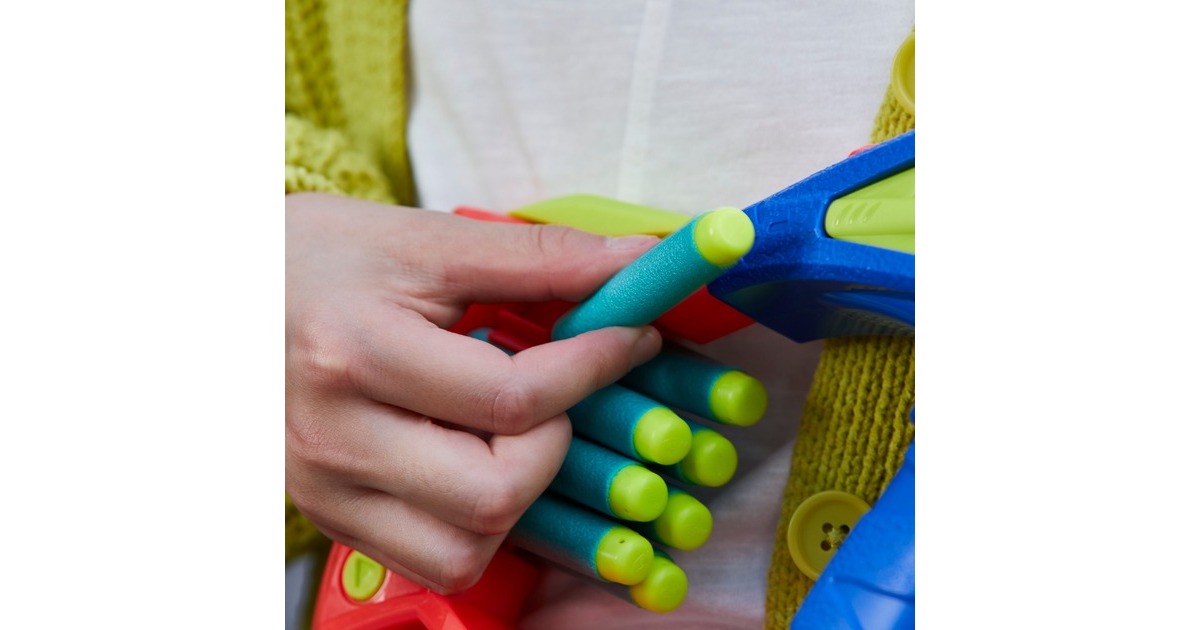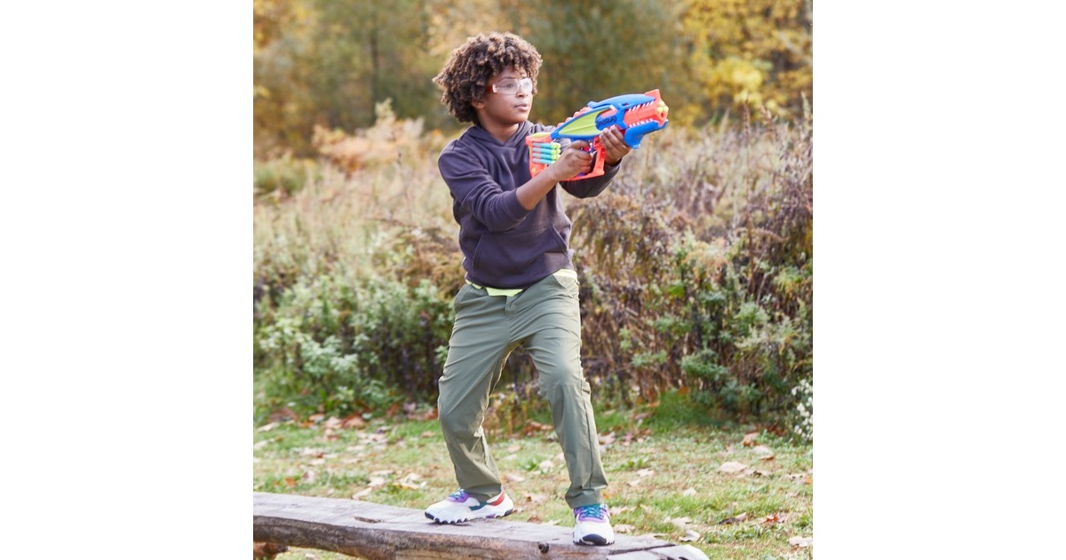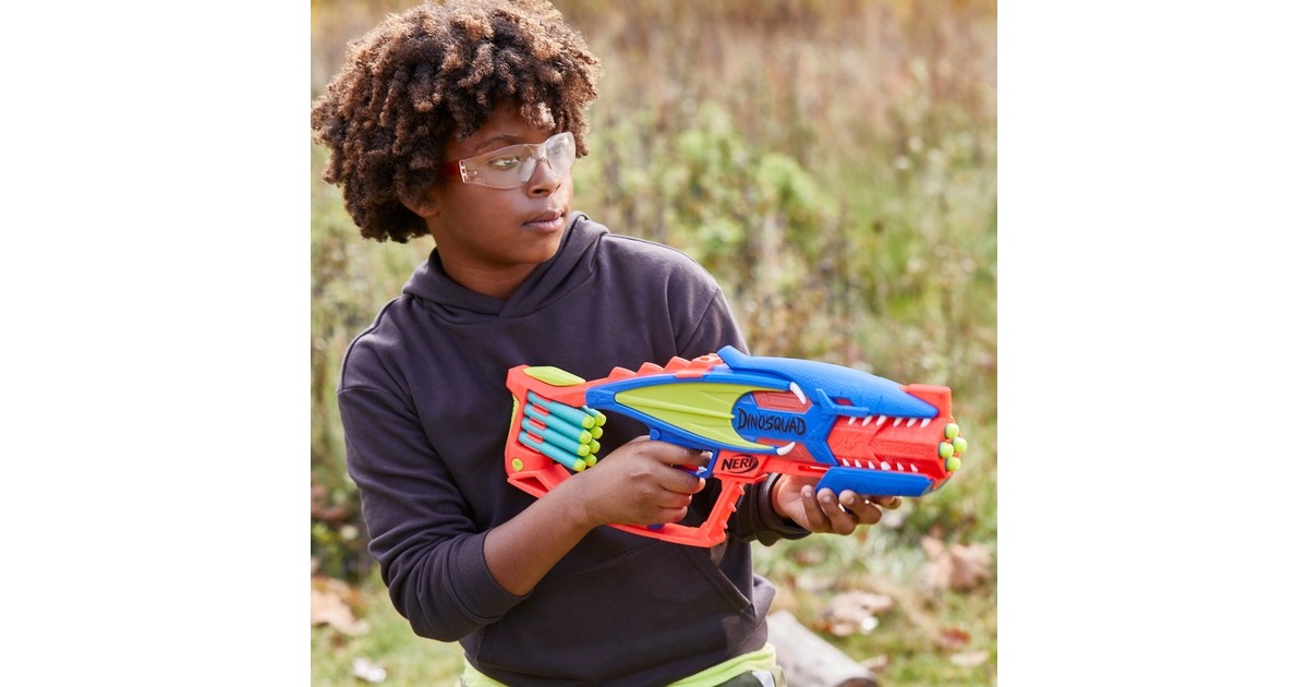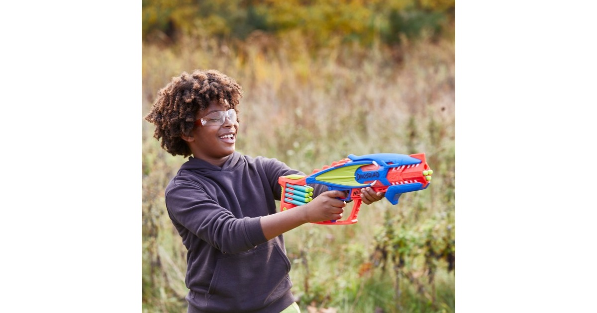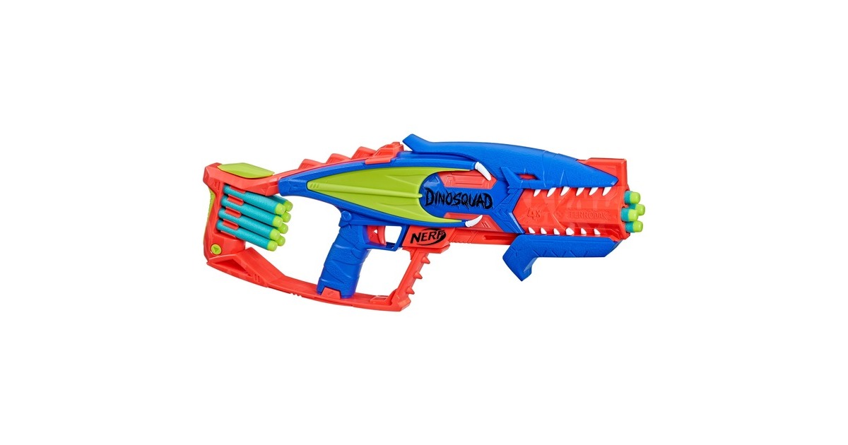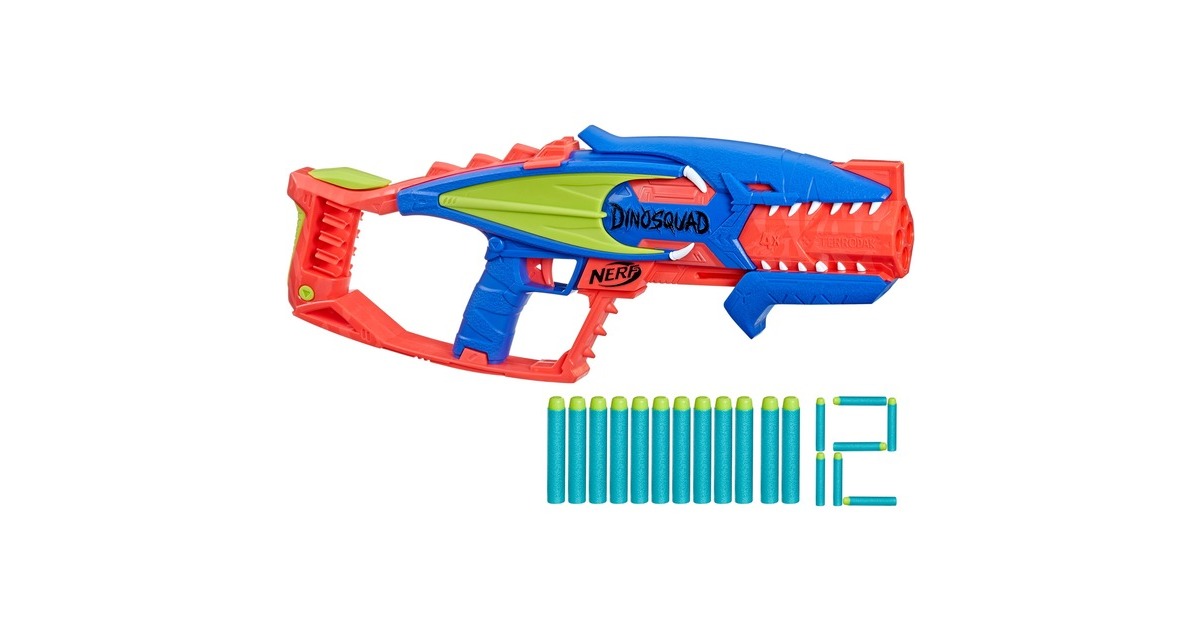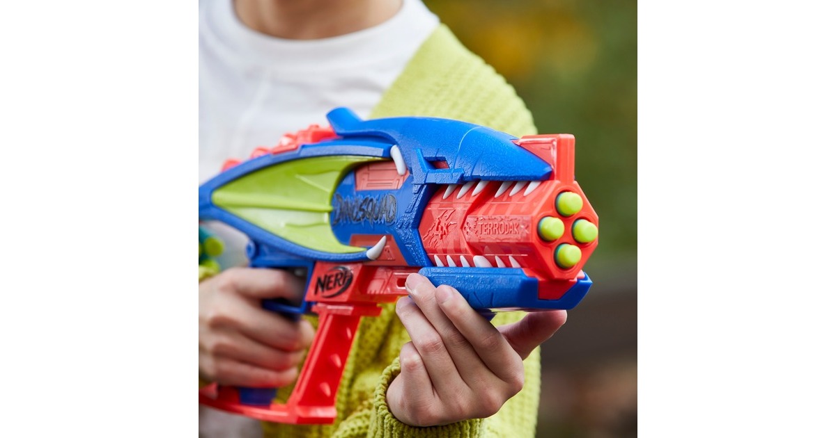 In der Elitetruppe DinoSquad verbünden sich Nerf-Fans mit legendären Sauriern. Mit dem Nerf DinoSquad Terrodak Blaster ist man bereit für coole Outdoor-Spiele. Der Blaster kommt in einem tollen Pterodaktylus Saurier-Design. Der Lauf des Spielzeug-Blasters fasst 4 Darts und feuert einen Dart nach dem anderen ab. Das Set enthält 12 Nerf Elite Darts, so stehen genügend Darts zum Bestücken des Nerf-Blasters und 8 zusätzliche Darts zum Nachladen bereit. Dank der integrierten Halterung sind die Darts zum Nachladen immer in Griffnähe. Einfach 4 Darts in den Lauf einlegen, den Pumpgriff vor- und zurückbewegen und den Abzug drücken - schon saust ein Dart durch die Luft. Art.-Nr.: 1894055