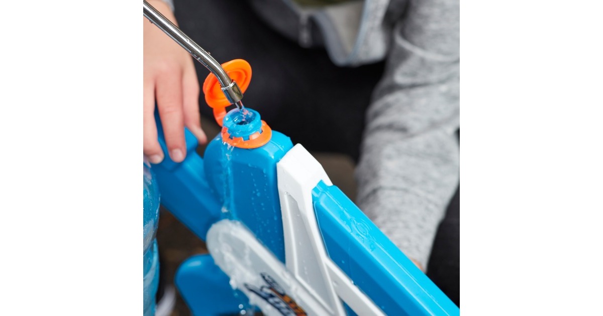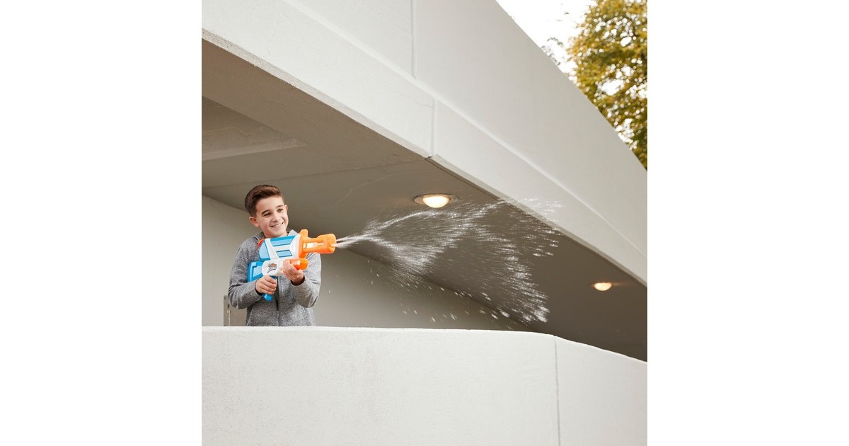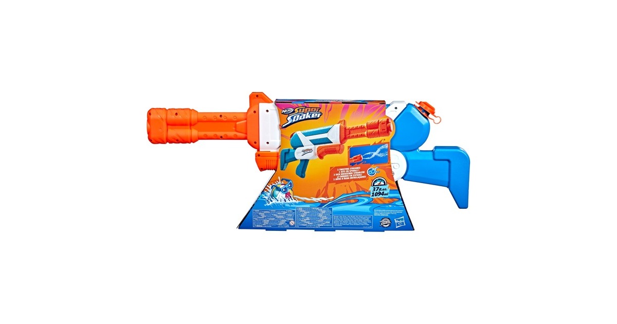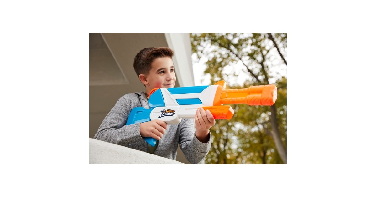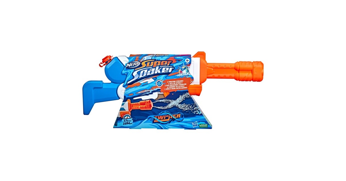 Der Nerf Super Soaker Twister Wasserblaster lädt die Fans ein, 2 sich kreuzende Wasserstrahlen abzufeuern. Dieser Super Soaker Blaster sorgt für jede Menge Action bei Outdoor Wasserschlachten. Wenn der Griff gepumpt wird, rotiert eine Trommel vorne am Lauf und sorgt für eine doppelte Wasser-Attacke, die die Mitspieler in den Schatten stellt. Der Twister Wasserblaster bereichert die Wasserschlachten mit seinen sich kreuzenden Wasserstrahlen. Er kann einfach gefüllt und abgefeuert werden. Der Deckel wird geöffnet, der Tank gefüllt, der Deckel geschlossen und der Griff vor- und zurückbewegt. Der Tank fasst bis zu 1094 ml. Die Nerf Super Soaker Marke sorgt seit 1989 für Wasser-Action und bietet nach wie vor jede Menge nassen Spaß.Art.-Nr.: 1778244