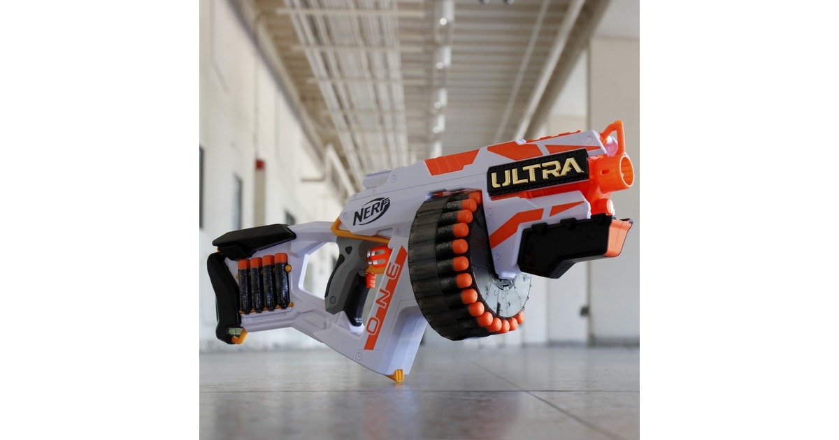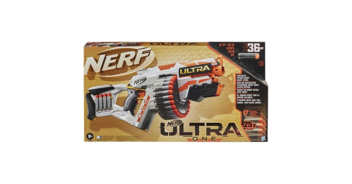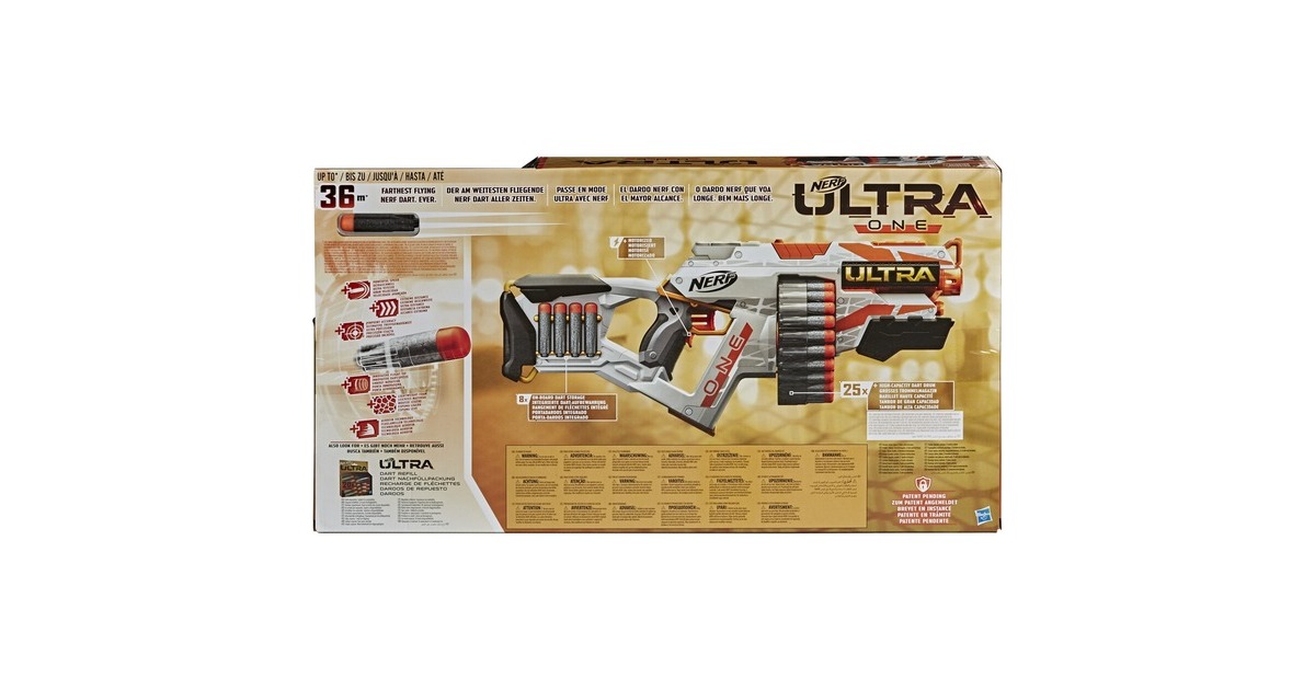 Nerf Ultra Blaster – der Gold Standard beim Abfeuern von Nerf Darts. Nerf Ultra Blaster haben ein weiterentwickeltes Design und eine verbesserte Leistung für mehr Reichweite, Treffgenauigkeit und Geschwindigkeit. Sie umfassen bahnbrechende Nerf Ultra Darts – die schnellsten Nerf Darts ALLER ZEITEN, mit innovativer Dart-Spitze, Aerofin-Technologie und Nerf Ultra Schaum. Nerf Ultra Blaster funktionieren nur mit Nerf Ultra Darts. Der motorisierte Nerf Ultra One Blaster hat ein 25-Dart-Trommelmagazin mit hoher Kapazität und kommt mit 25 Nerf Ultra Darts. Dieser Nerf Ultra Blaster ermöglicht das Abfeuern von über 2 Dutzend Darts vor dem Nachladen. Die Darts fliegen bis zu 36 Meter weit. Durch die Dart-Aufbewahrung können Ersatzdarts in der Nähe aufbewahrt werden. Dieser Blaster ist für erfahrene Nerf Battler, die das Spiel auf die nächste Ebene heben und ihre Fähigkeiten und Erfahrung nutzen möchten. Der Nerf Ultra One Blaster und die Nerf Ultra Darts sorgen für die maximale Leistung.Art.-Nr.: 1651000