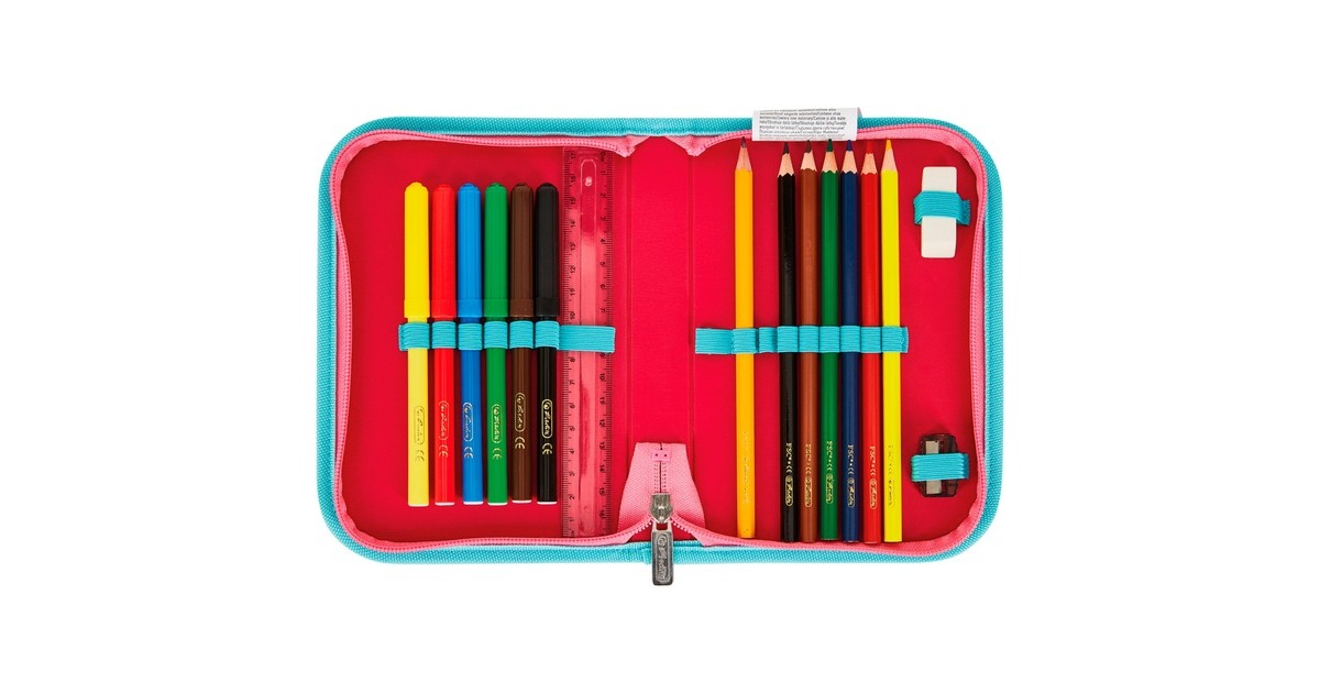 inkl. 16 tlg. befülltem Schüleretui mit mit FSC zertifizierten Bunt- und Bleistiften, Faulenzer-Mäppchen, Sportbeutel | robuste Bodenplatte mit Kunststoff-Füßen |