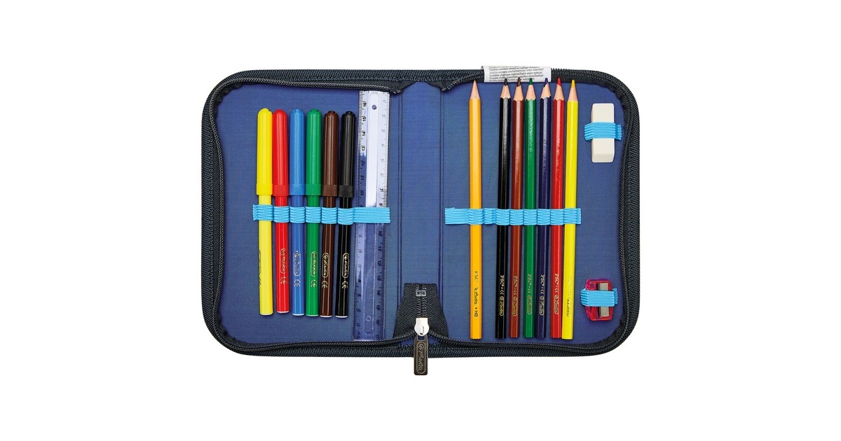 inkl. 16 tlg. Schüleretui mit mit FSC zertifizierten Bunt- und Bleistiften, Faulenzermäppchen, Sportbeutel |