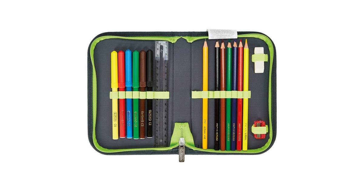 inkl. 16 tlg. Schüleretui mit mit FSC zertifizierten Bunt- und Bleistiften, Faulenzermäppchen, Sportbeutel |