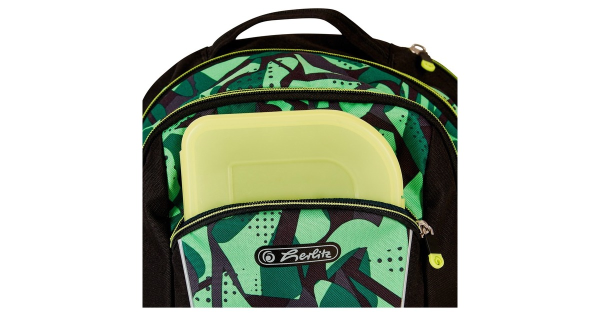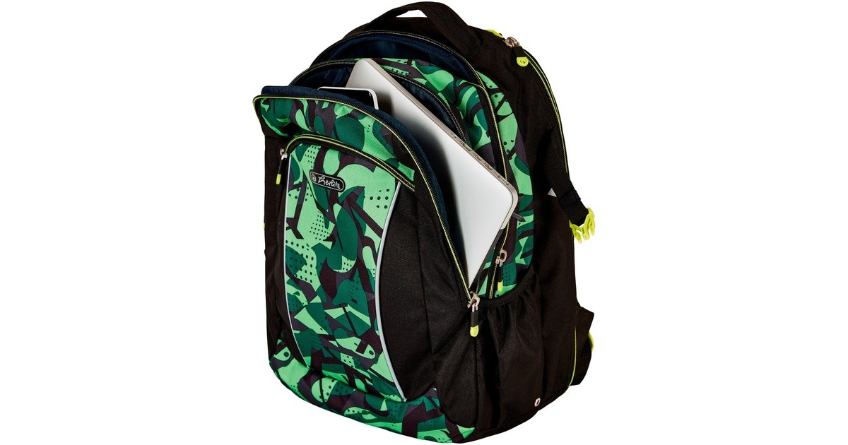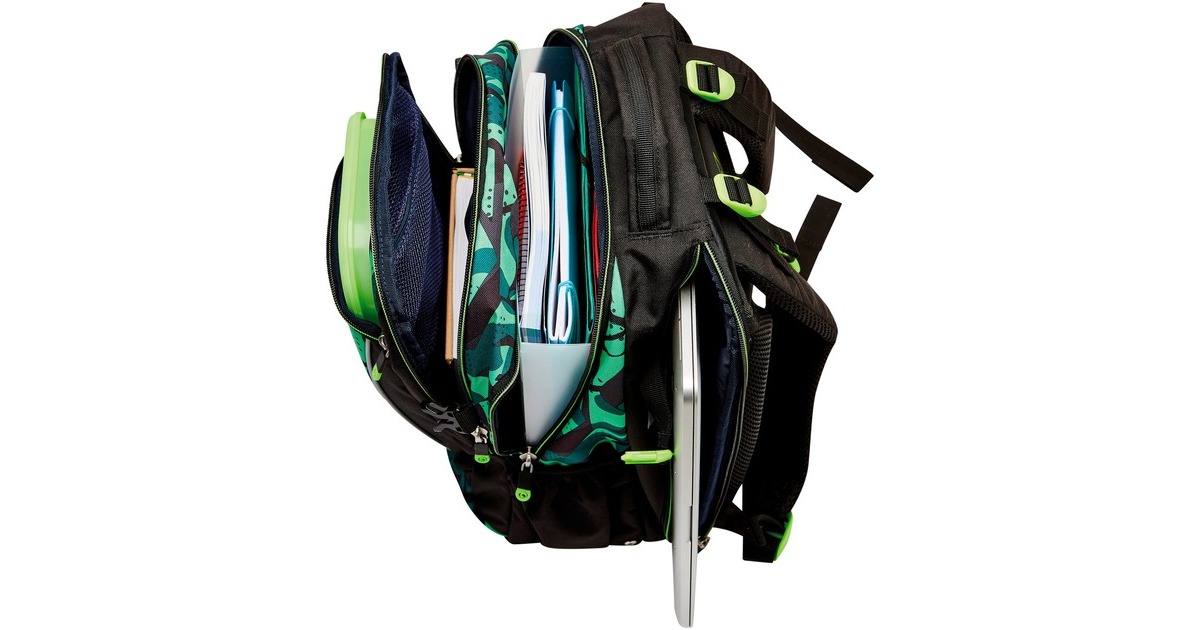 Frontfach, Seitenfach, drei Innenfächer mit integriertem Buchfach, zwei Seitentaschen mit Gummizug |