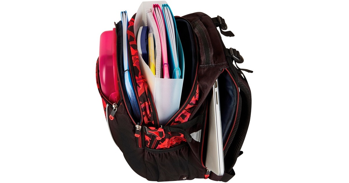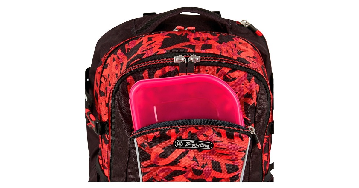 Frontfach, Seitenfach, drei Innenfächer mit integriertem Buchfach, zwei Seitentaschen mit Gummizug |